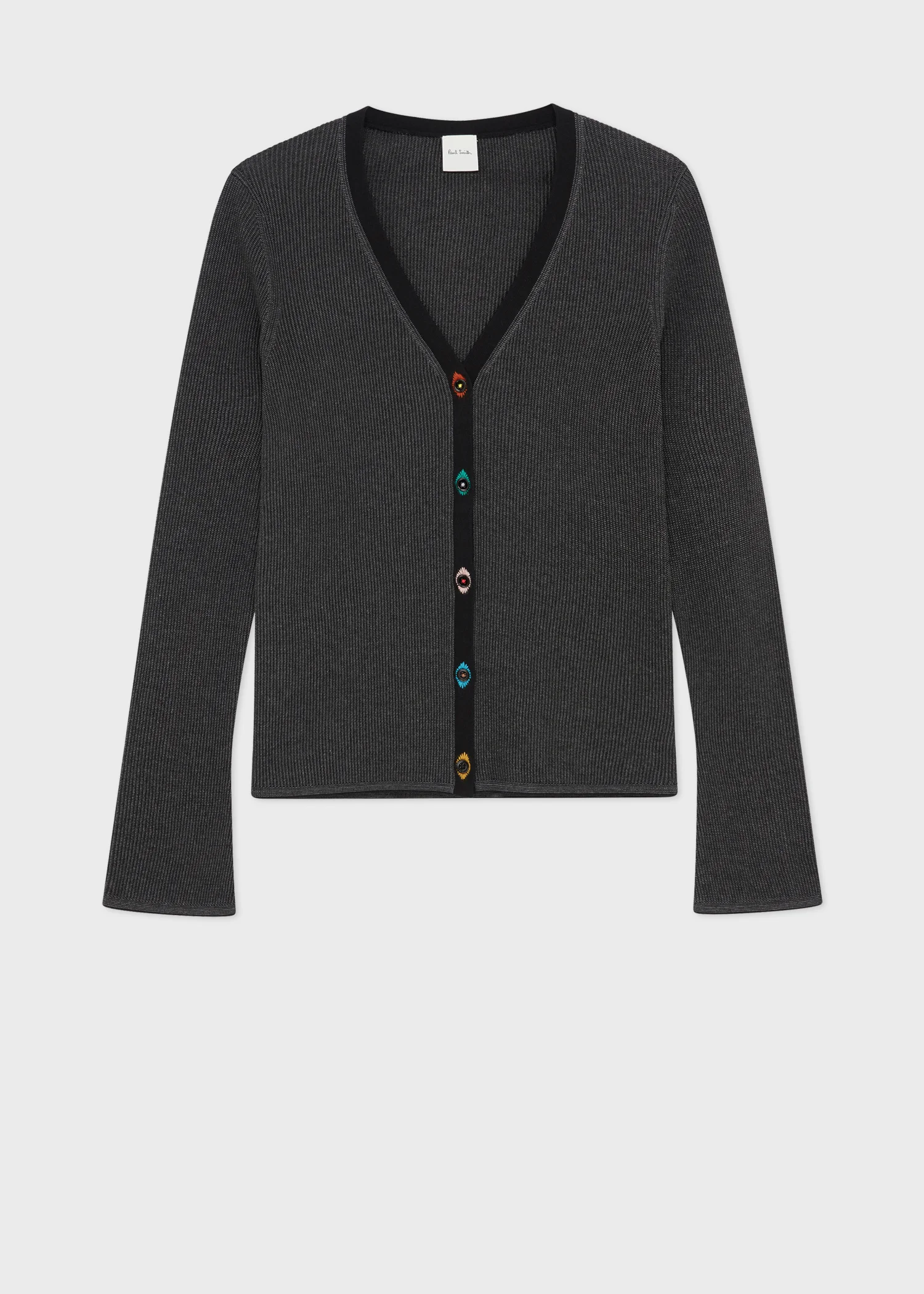 Knitted from organic cotton, this black cardigan features a button-through front, ribbed trims and a contrasting V-neckline. Finished with multi-coloured buttons, flared cuffs and tonal stitching. The Fit Regular-Fit is relaxed through the body. Product Code: W1R-538N-T11147-79