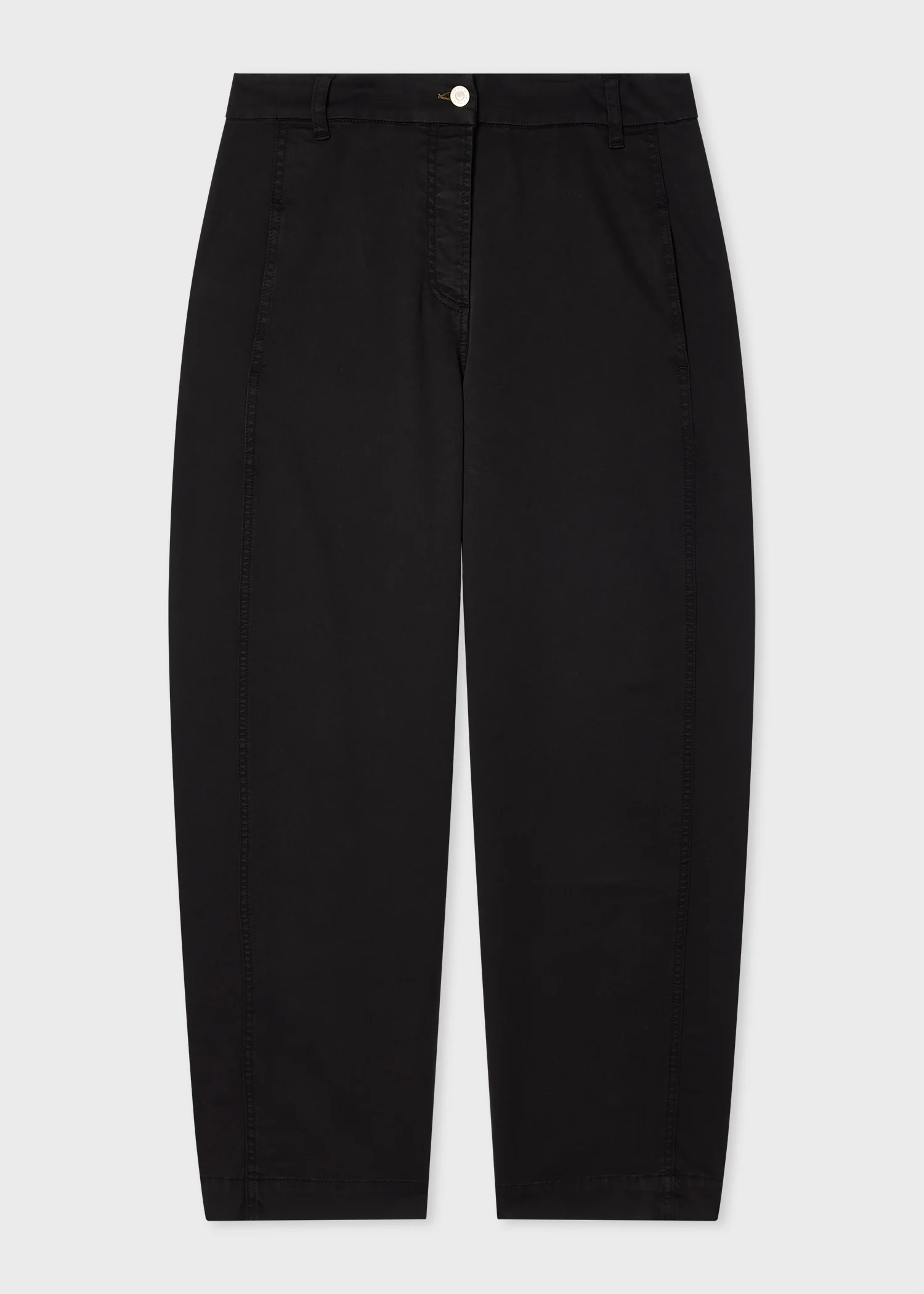 Made from a soft cotton-blend fabric with added stretch, these black barrel-leg trousers offer a contemporary silhouette. Complete with tonal stitching, the trousers feature twin-slit pockets at the front and a back pocket with patch detailing. The versatile design makes them an effortless addition to your everyday wardrobe, perfect for creating a more casual, polished look. The Size Model wears a size (40) 8 Model measures: Height 5’11’’ / 180cm | Chest 30½’’ / 78cm | Waist 24’’ / 61cm The Fit - Barrel-Fit features a relaxed shape through the thigh that tapers at the ankle Product Code: W2R-360T-T30879-79
