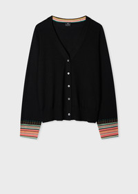 Made from a merino-wool blend this black cardigan is crafted from a lightweight knit construction and features metallic stripe detailing and pointelle detailing to the cuffs. A versatile piece, this elegant cardigan offers a great layering option for the colder seasons. The Fit - Regular-Fit is relaxed through the body. Product Code: W2R-578N-T31327-79