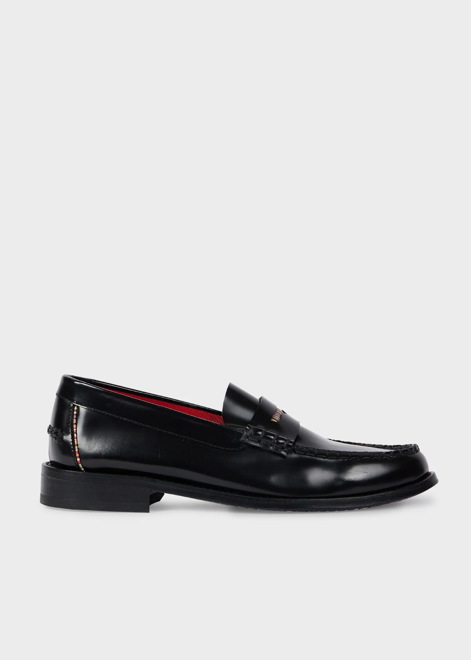 Made in Portugal from premium calf leather uppers, these black 'Laida' loafers feature a classic design with 'Signature Stripe' detailing for an added twist. Finished with contrasting interior and treaded stripe soles. 100% Leather Uppers 100% Leather Soles Made in Portugal Product Code: W1S-LAA05-NLEA-79