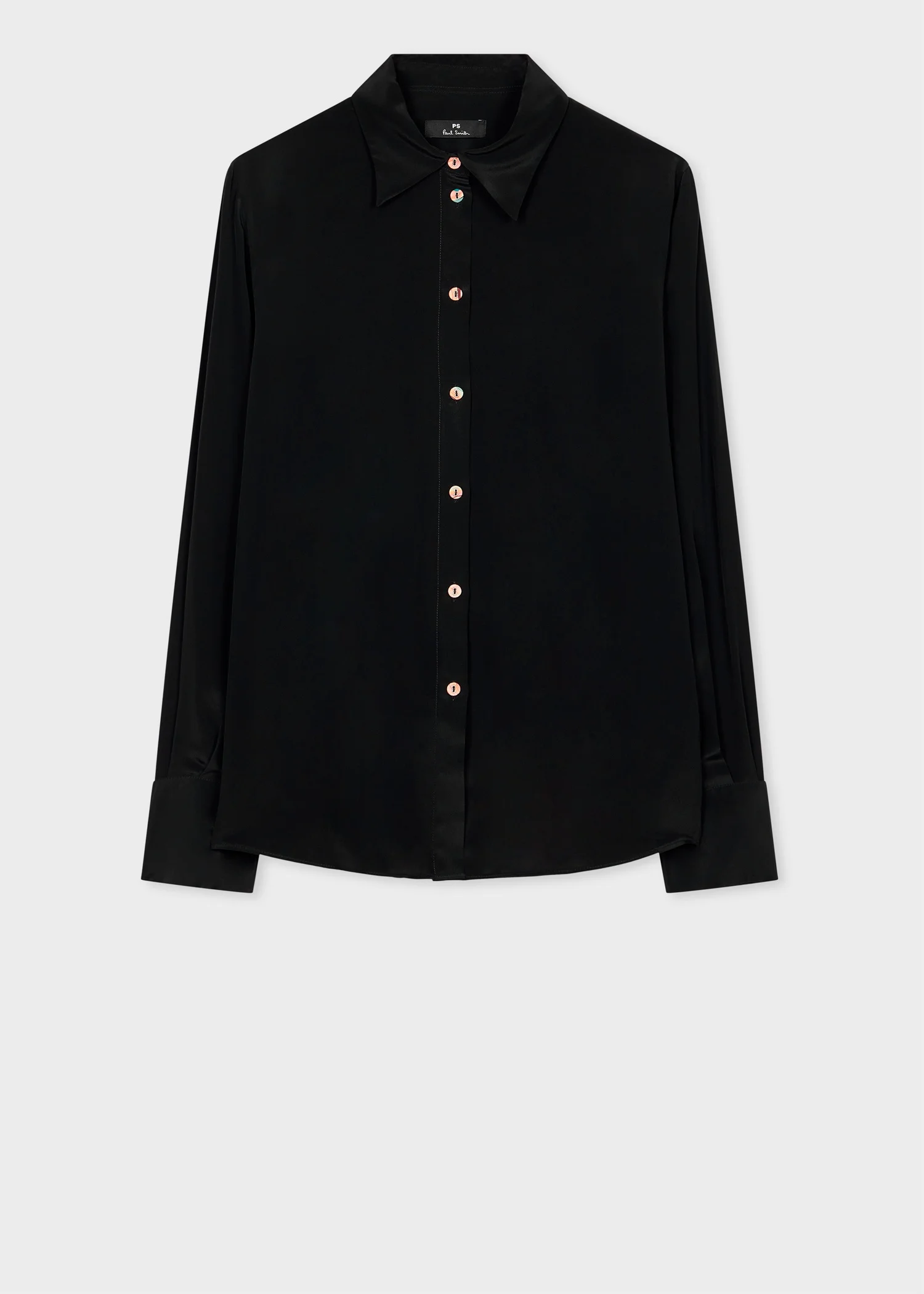 Made in Portugal from an acetate-silk mix this black blouse features, darts to the back and a button placket and cuffs for sophisticated styling. Each button is covered with the iconic 'Swirl' design for a playful touch. 81% Acetate, 10% Silk, 9% Polyamide Dry Clean Only Made in Portugal The Fit Regular-Fit is relaxed through the body. Product Code: W2R-335B-N31186-79