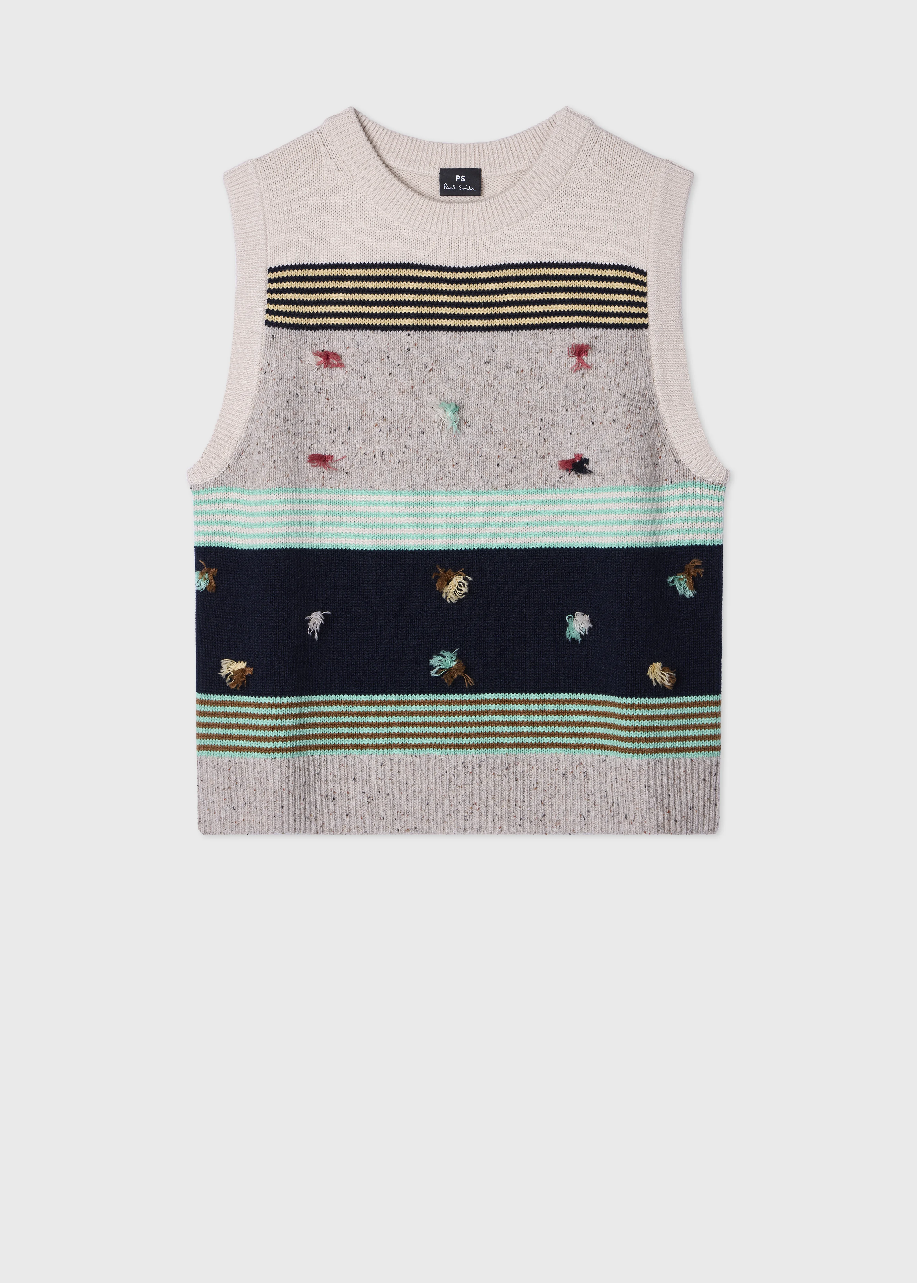 Made from a wool and cotton blend, this knitted tank top features an ecru base decorated with a block stripe design in mixed knit techniques and colourways, and additional tassels for added texture. The tank is complemented with ribbed trims and a crew neck collar. Wear individually or layered with a shirt for elevated transitional styling. The Fit - Regular-Fit is relaxed through the body. Product Code: W2R-800N-V31413-08