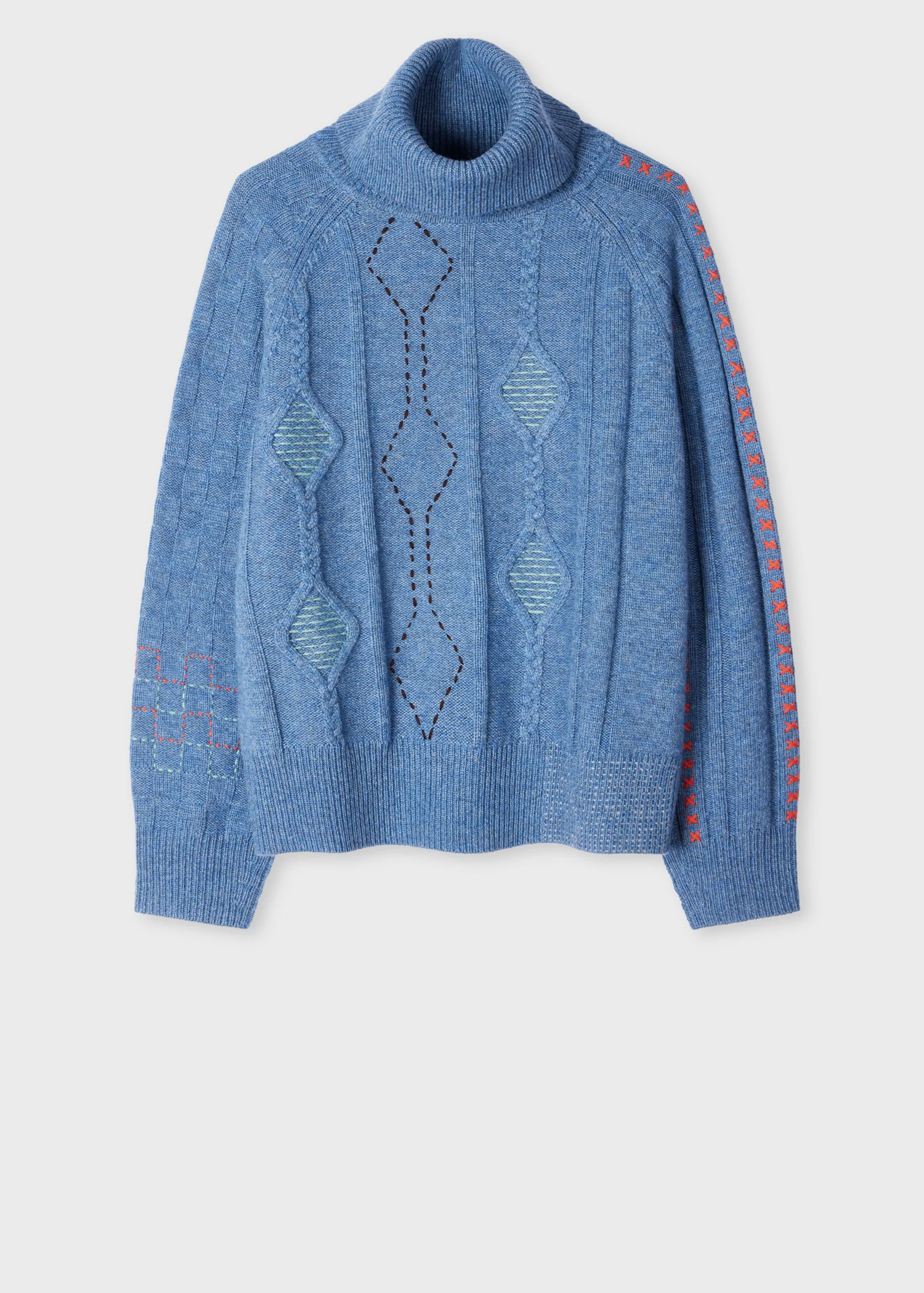 Women's Blue Cable Knit Patchwork Roll Neck Sweater
