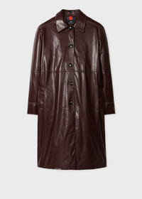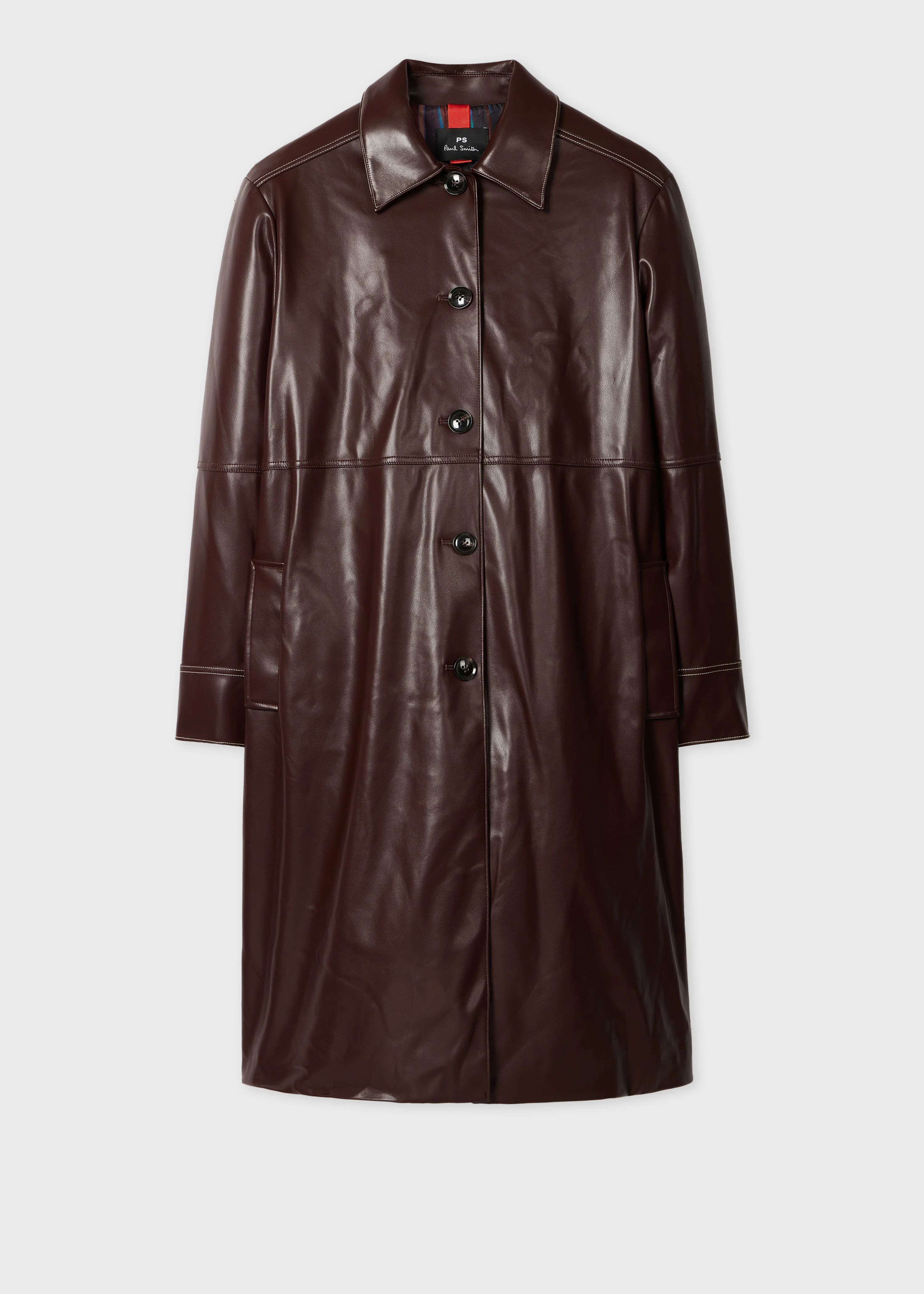 Elevate your attire this season with this modern trench coat made from a faux leather construction in a rich chocolate brown hue. Complete with subtle contrast stitching on the collar and vent, oversized button fastenings, side seam pockets, and interior 'Midnight Swirl' poly lining. The Fit - Oversized is cut for a loose, oversized fit - perfect for seasonal layering Product Code: W2R-284C-T31350-69A