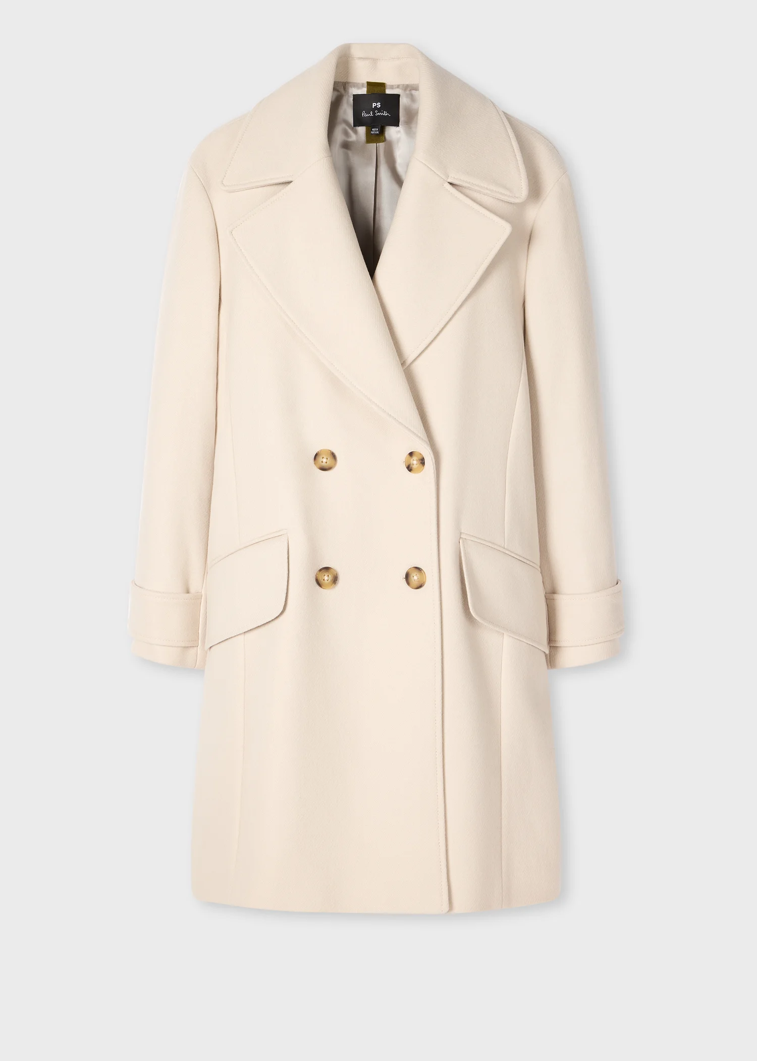 Made in Portugal from a wool and cashmere blend, this double-breasted coat is the perfect piece to pair with your seasonal wardrobe. Cut to a regular fit for layering purposes, it is best to be oversized. Complete with an exaggerated lapel and subtle shaping for a feminine fit, this coat is complemented with belt detailing to the cuffs and faux flap pockets. The Size Model wears a size 40 (UK 8) Model measures: Height 5’11’’ / 180.5cm | Chest 30½’’ / 78cm | Waist 23’’ / 59cm The Fit - Regular-Fit is relaxed through the body. Product Code: W2R-354C-T21059-04A