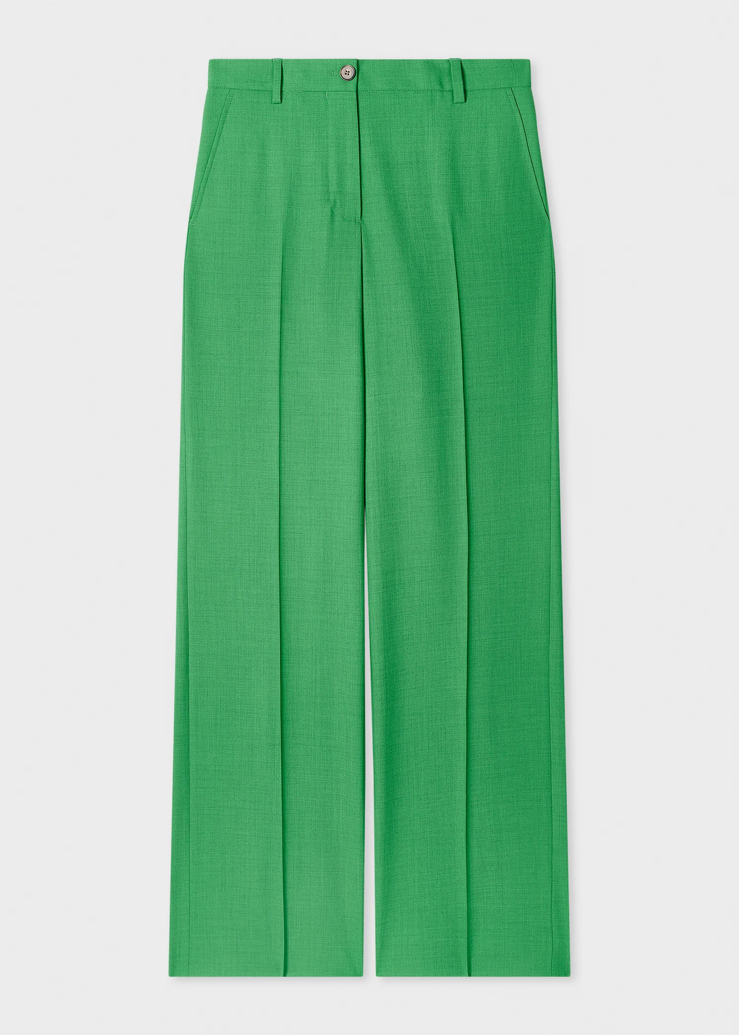 Crafted in Italy from a premium wool-blend fabric, these green wide-leg trousers will add a statement touch to your seasonal wardrobe. Expertly finished with feminine pleat detailing to the centre, button-fastening rear jetted pockets, and side seam pockets to the front, the trousers can be paired with the matching blazer or worn as a standalone piece. The Size Model wears a size 40 (UK 8) Model measures: Height 5’11’’ / 180cm | Chest 30½’’ / 78cm | Waist 24’’ / 61cm The Fit - Wide-Leg Product Code: W1R-332T-T02372-31