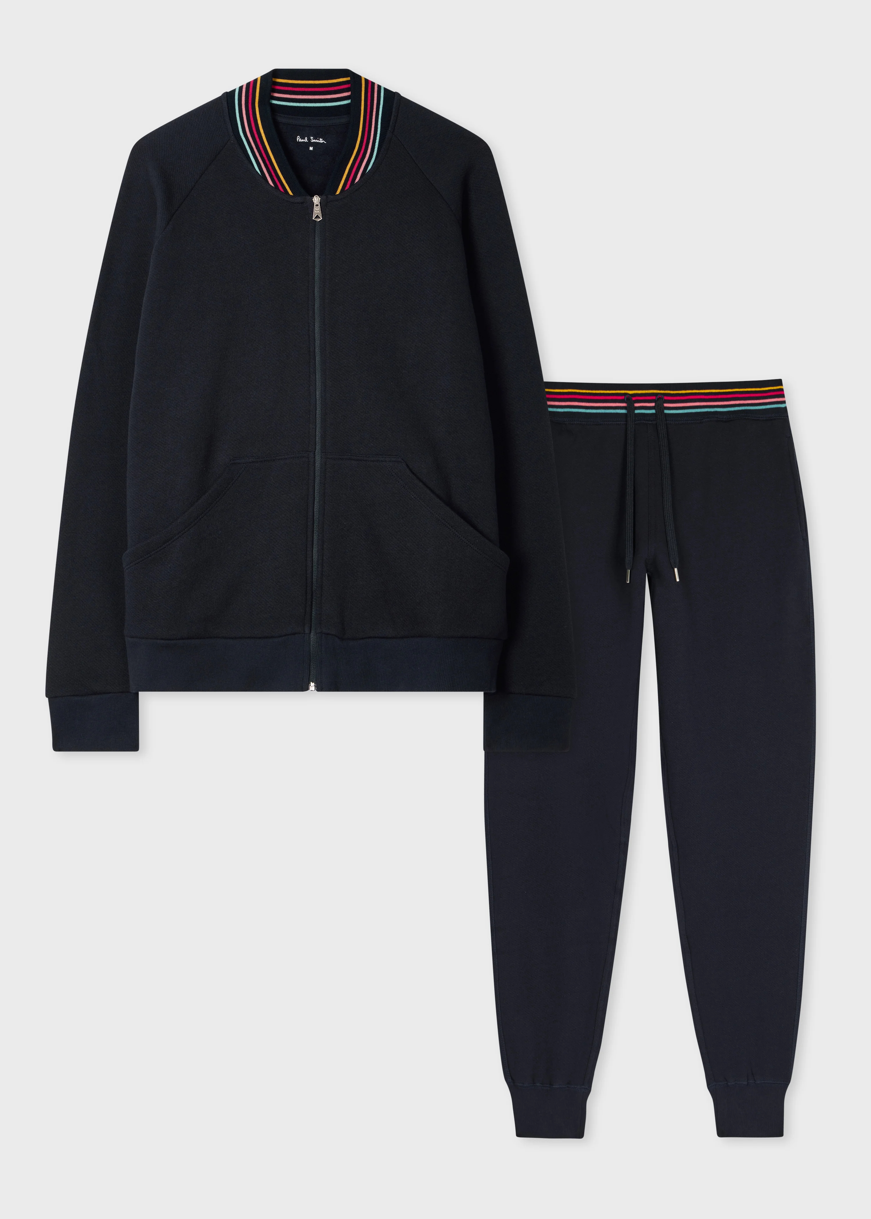 Crafted from a rich cotton construction this navy loungewear set features a bomber jacket and sweatpants with a 'Swirl' trim. Product Code: W1A-ECOMM-TU1020-47