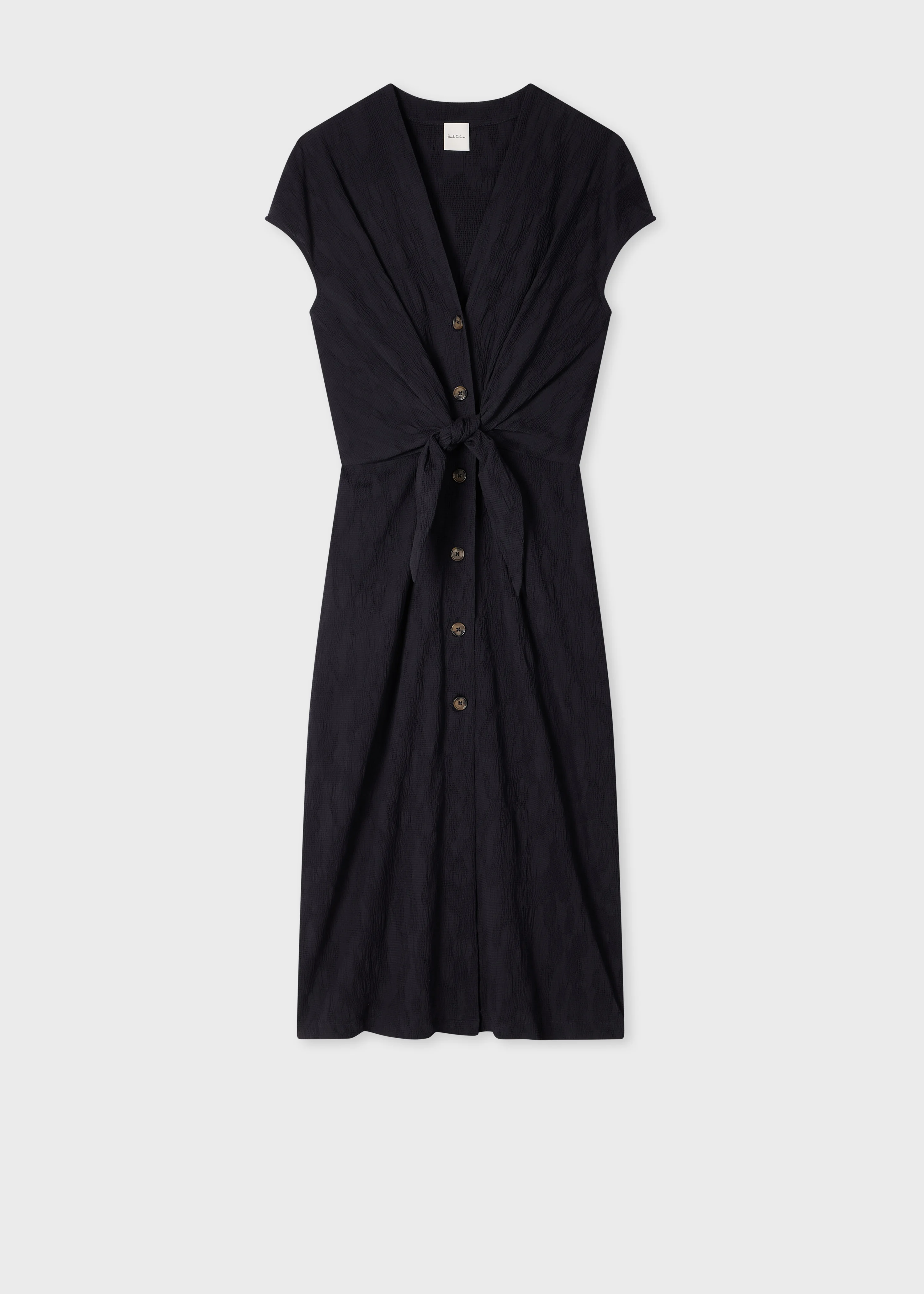 Made in Portugal from a cotton and viscose blend, this navy midi dress features a seersucker base with an overlaying applique design for added texture. Finished with cap sleeves and a tie-waist detail, to create a soft, feminine silhouette. Perfect for seasonal styling, pair with sandals for an effortless daytime look. The Fit - Regular-Fit is relaxed through the body. Product Code: W1R-722D-V11232-49