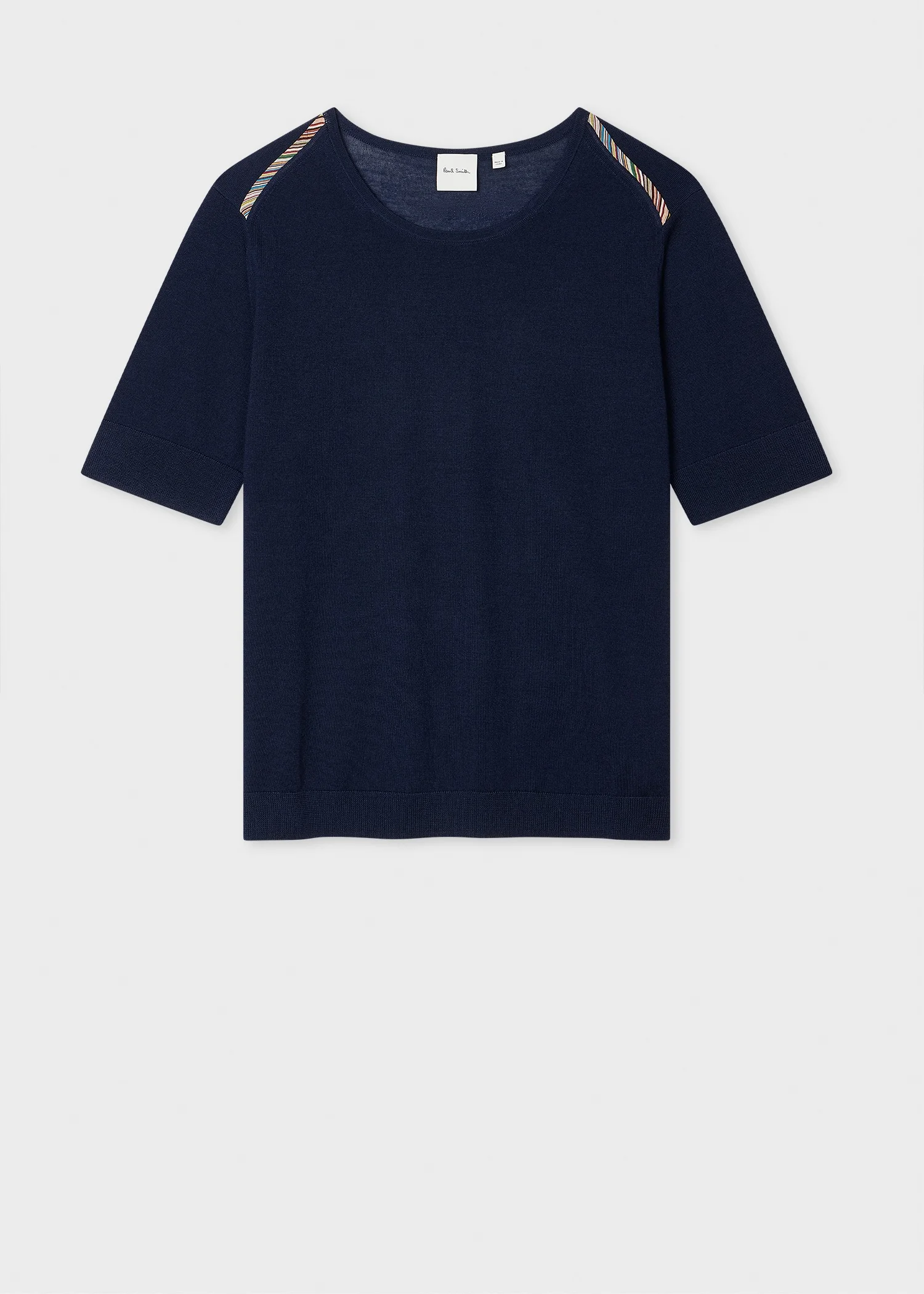 Made from a luxurious blend of wool and silk, this navy short-sleeved knitted top offers exceptional comfort and a refined finish. Complete with a 'Signature Stripe' to the shoulders for a distinctive touch. The premium materials provide a soft feel against the skin while maintaining an elegant drape. Versatile and sophisticated, this knit top is perfect for both casual and more elevated occasions. Knit: 75% Wool, 25% Silk, Woven: 100% Silk The Fit - Regular-Fit is relaxed through the body. Product Code: W1R-610N-T11146-49
