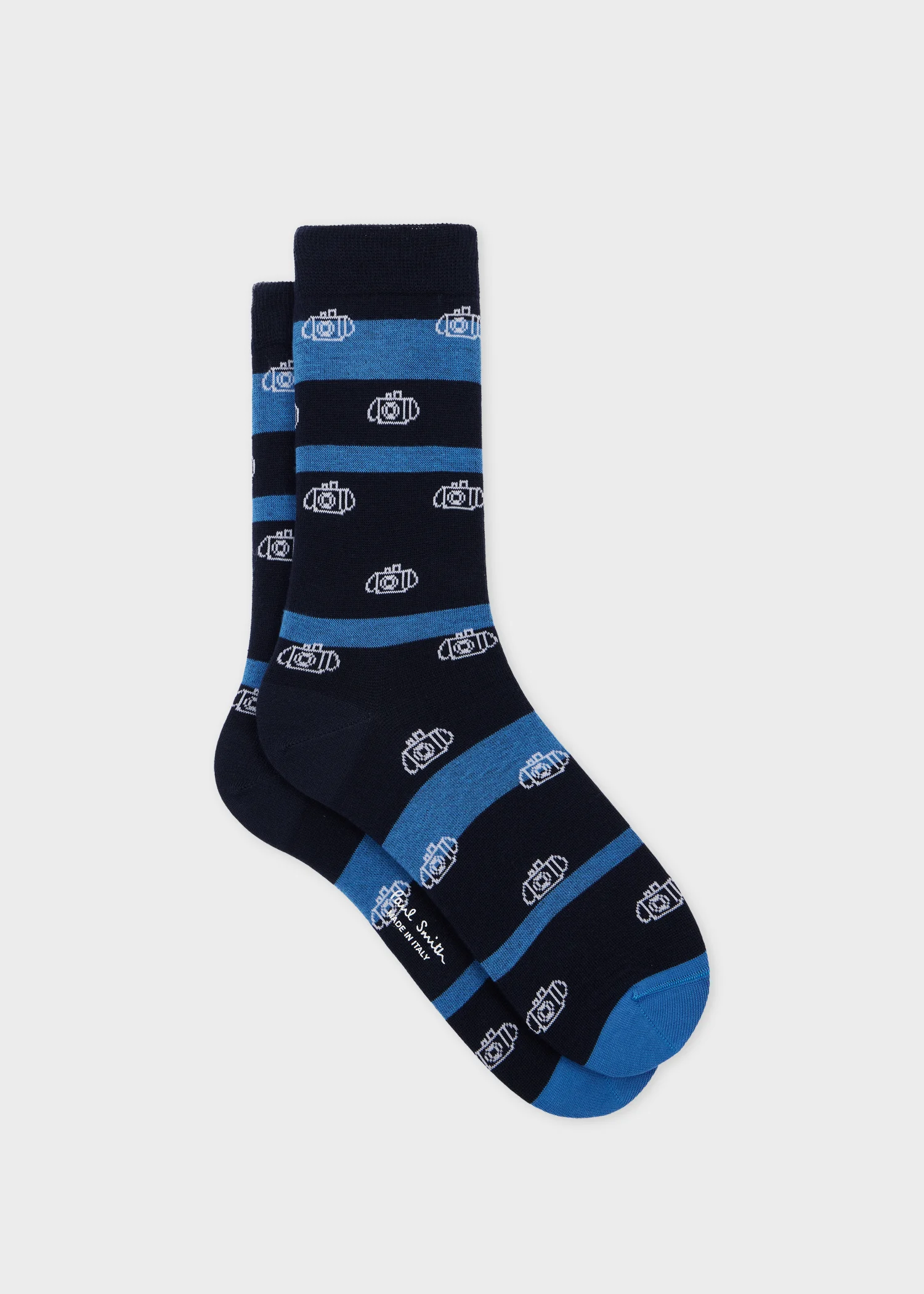 Made in Italy from a soft cotton-blend, these navy socks feature a stripe and camera pattern. Product Code: W1A-086MO-T778-47
