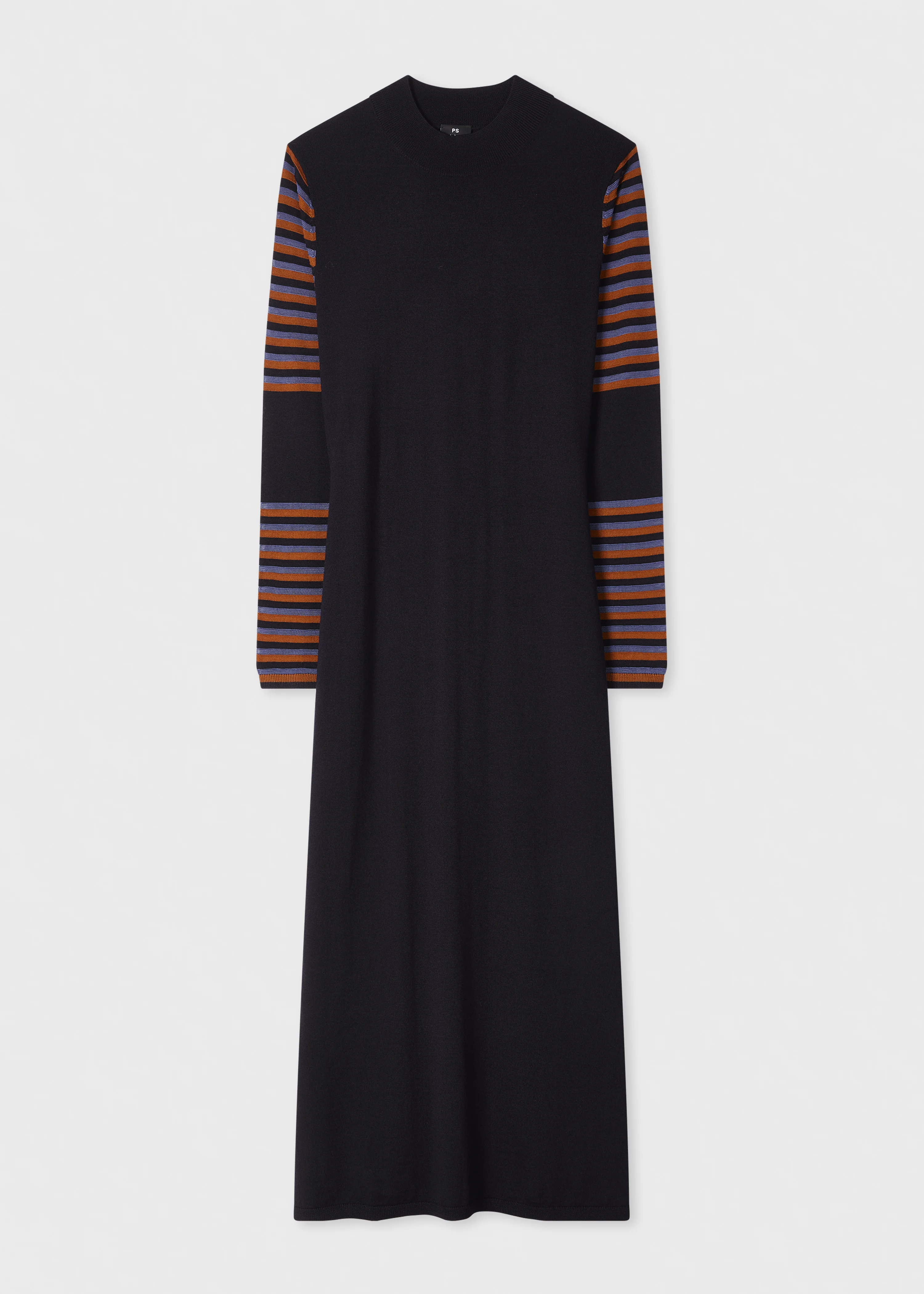 Crafted from a merino wool blend, this navy knitted midi dress features contrasting striped sleeves for a unique touch. In a lightweight knit, the dress features ribbed trims. Ideal for the transitional season, pair with ankle boots for elevated everyday styling. The Fit - Regular-fit Product Code: W2R-659N-T31383-49