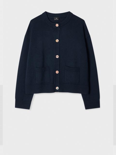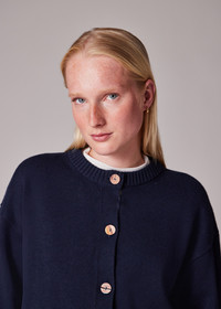 Crafted from a luxurious blend of wool and cotton, this navy knitted cardigan provides versatile style with a classic button-through design with a 'Swirl' trim placket. Featuring a refined silhouette, this cardigan can be effortlessly styled over a simple tee or elegant blouse for a polished everyday look. The Fit - Regular-Fit is relaxed through the body. Product Code: W2R-585N-T31330-49