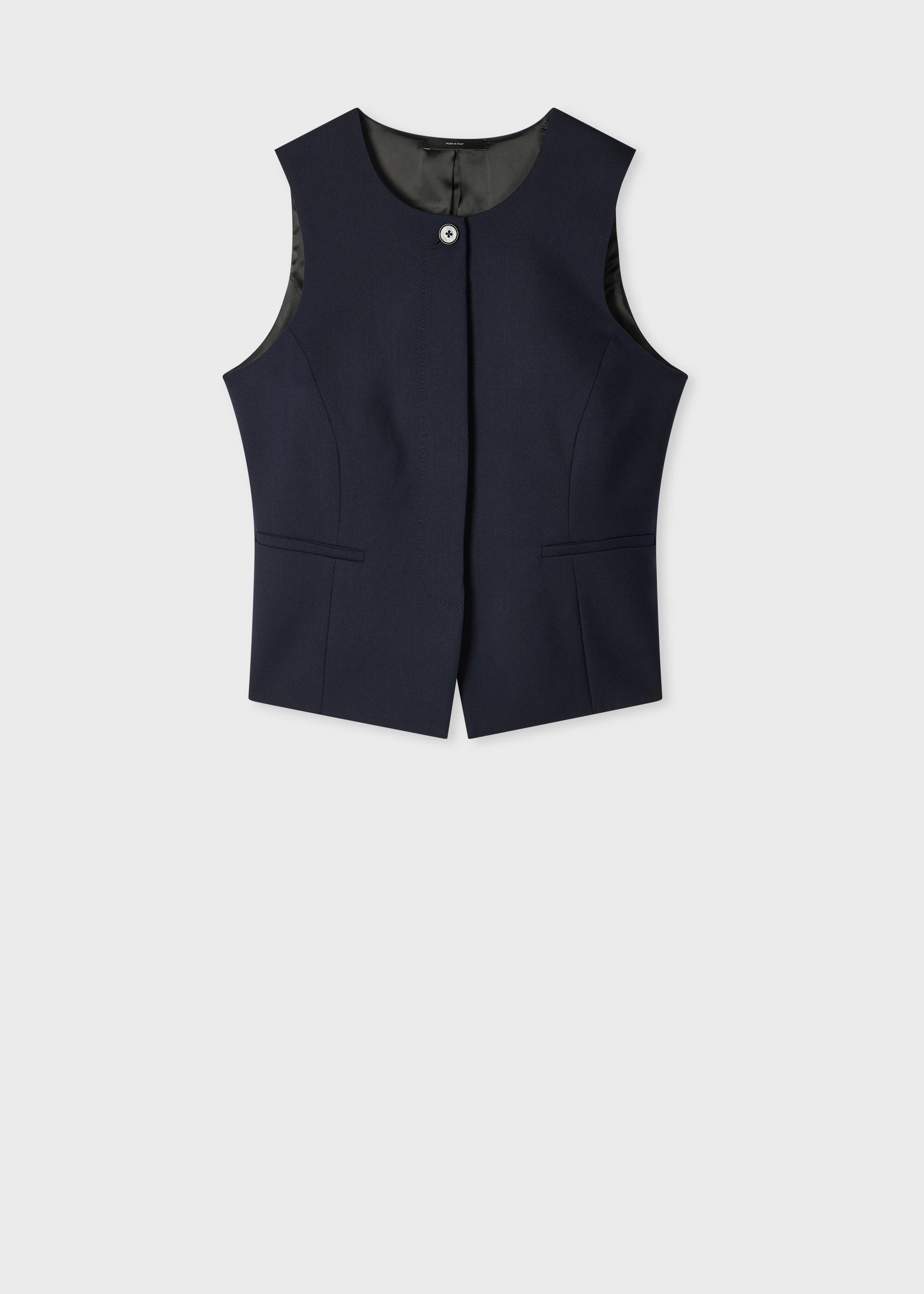 Crafted in Italy from pure wool, this navy waistcoat showcases a modern asymmetric silhouette. Designed with a tonal viscose lining for enhanced comfort and structure, it also features faux pockets for a clean, streamlined finish. Pair with tailored trousers or a crisp shirt for a refined look. Product Code: W1R-439J-V00001-49
