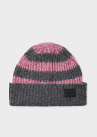 Women's Pink and Grey Lambswool-Blend Block Stripe Beanie and Scarf Set