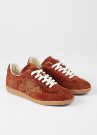 Made in Portugal from suede leather uppers, these rust 'Como' trainers feature a debossed floral design to the side panel for a unique touch. Finished with sturdy Vibram rubber cupsoles, a 3D Paul Smith logo emblem, and 'Signature Stripe' panel at the heel. Ideal for adding a seamlessly branded touch to your trainer collection. Product Code: W1S-CMO05-TSUE-19