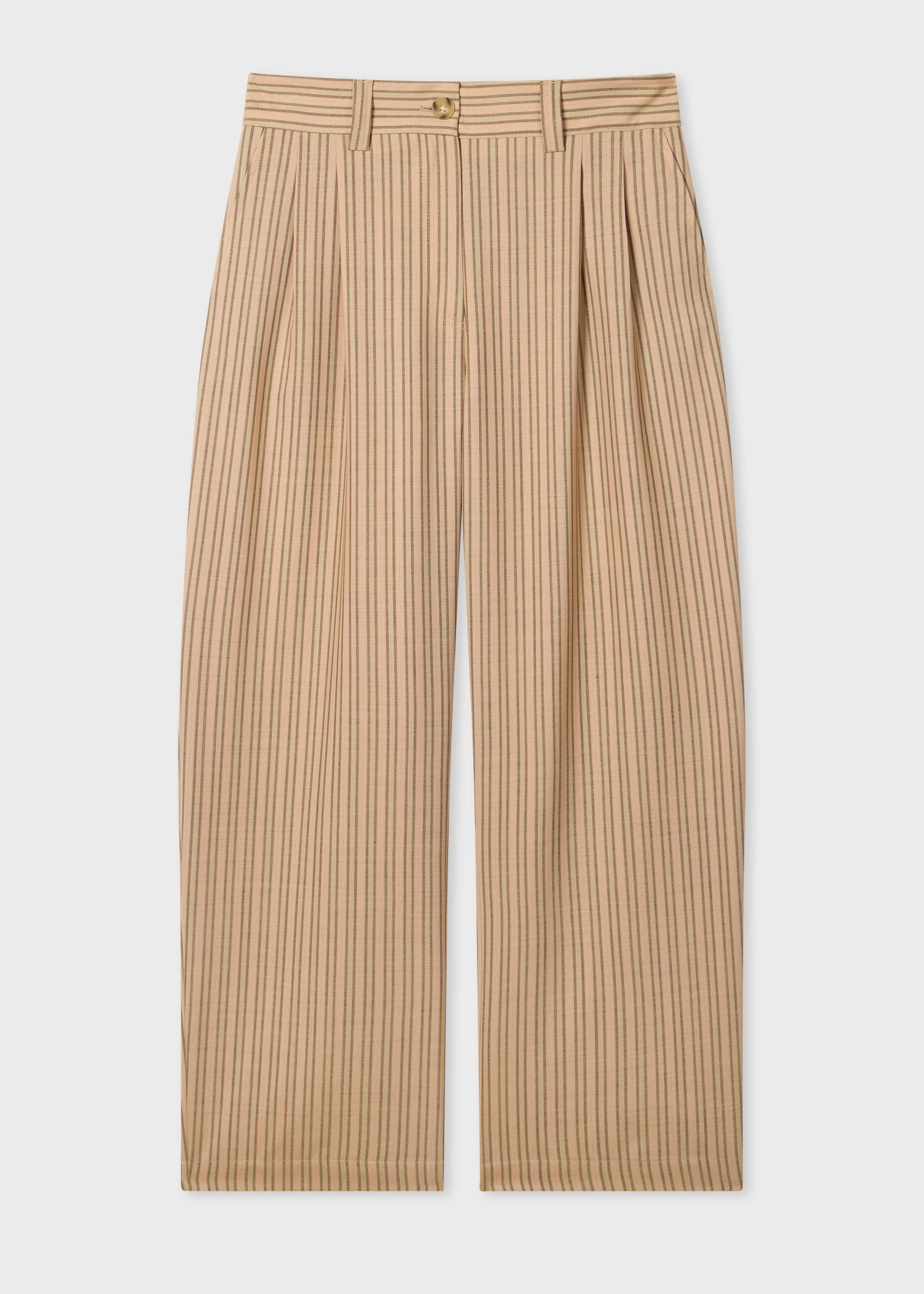 Made in Portugal from 100% wool, this sand two-piece suit features a stripe pattern throughout for a refined yet relaxed look. Cut to a slightly relaxed regular fit, the blazer is complemented with slanted faux pockets, a twin-button fastening, and a tonal viscose lining for a smooth finish that is super comfortable for seasonal styling. The trousers are cut for a wide-leg fit. Product Code: W2R-SUIT-V31425-62