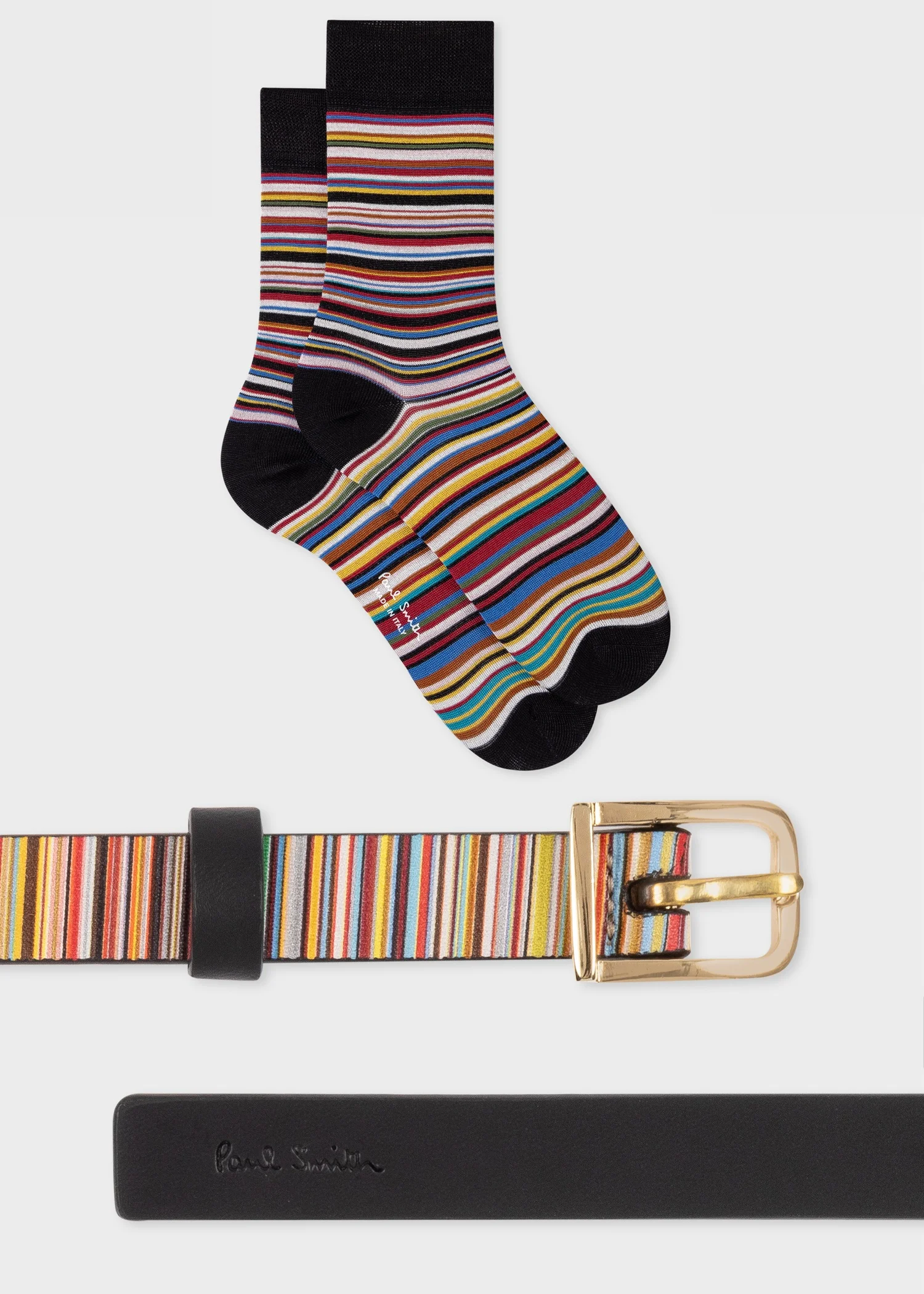 Presenting Paul Smith gift sets, specially curated gift sets presented in a Paul Smith box and gift wrap, making it easier to treat you or a loved one during the holiday season. This gift set includes: [b]Women's Leather 'Signature Stripe' Belt[/b] Made in Spain from premium leather, this black belt features our iconic 'Signature Stripe' throughout - adding a signature flash of colour to this timeless style. The perfect accessory to elevate any outfit, this slim belt is finished with a gold buckle fastening. Complete with a tonal signature logo detail. Belt width: 1.5 cm 100% Leather Made in Spain [b]Women's 'Signature Stripe' Silk-Mix Socks[/b] Made in Italy from a soft silk blend, and featuring the iconic Paul Smith 'Signature Stripe' throughout, these socks are finished with a black heel, toe and ankle. 72% Silk, 26% Polyamide, 2% Elastane Machine Washable Made in Italy Product Code: W1A-ECOMM-NGIFT4-00
