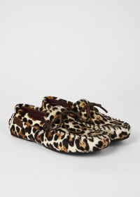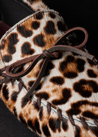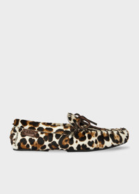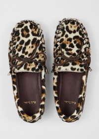 Made in Portugal from a leather upper construction decorated with faux pony hair with a leopard print design for statement styling. Complemented with leather tie detailing threaded throughout the shoe with metal aglets. The moccasins are complete with rubber soles with treaded detailing for extra grip. Product Code: W1S-SNN02-UPNY-68