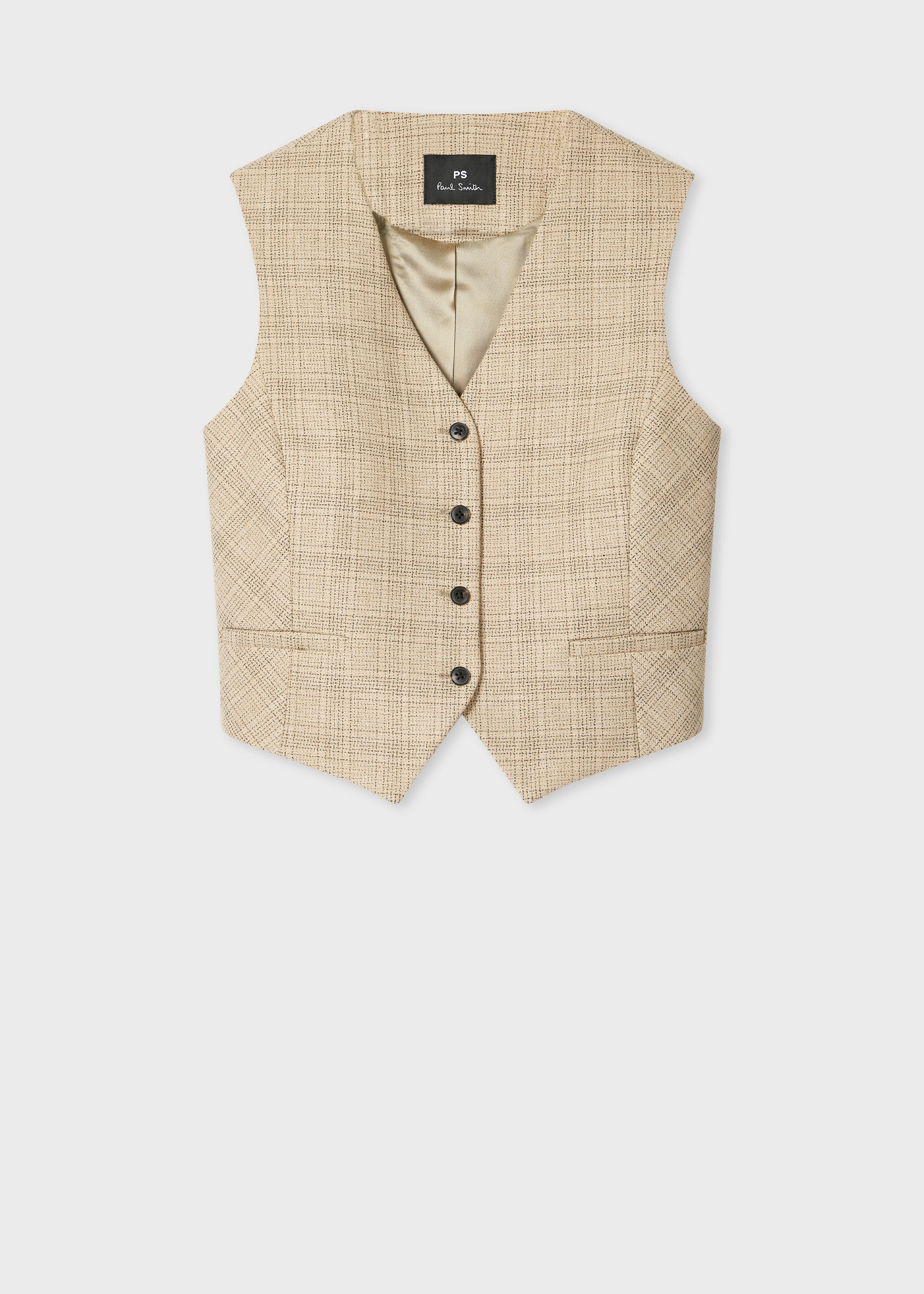 Made in Portugal from a mixed wool-blend, this stone waistcoat features a subtle flecked check design throughout. In a classic waistcoat silhouette with a contrast four-button closure, subtle rear vent, and faux pockets at the front. This piece is perfect for standalone styling or paired with matching tailoring. The Size Model wears a size 8 Model measures: Height 5’11’’ / 180.5cm | Chest 30½’’ / 78cm | Waist 23’’ / 59cm The Fit - Tailored-fit Product Code: W2R-396J-T31343-62