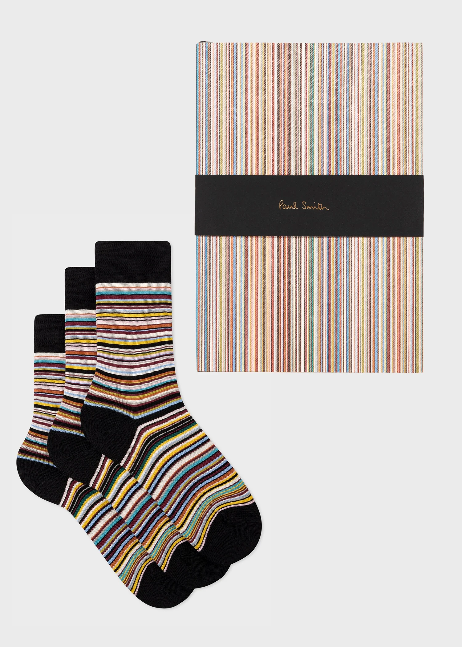 Presenting Paul Smith gift sets, specially curated gift sets presented in a Paul Smith box and gift wrap, making it easier to treat you or a loved one during the holiday season. This gift set includes: [b]Women's 'Signature Stripe' Socks Three Pack[/b] Made in Italy from a soft cotton blend, this three-pack of socks feature our iconic 'Signature Stripe' pattern throughout, complete with black cuffs, heels and toes. Made in Italy 80% Cotton, 13% Polyamide, 1% Elastane Machine Washable [b]'Signature Stripe' Notebook[/b] This lined paperback notebook features a Paul Smith signature page footer, black ribbon marker and gold-foil page edging. This classic notebook is finished with a bold, removable black paper card slip across the centre exterior, finished with a gold Paul Smith signature. Size: 21 x 15.3cm 100% Paper, lined Product Code: W1A-ECOMM-NGIFT5-00