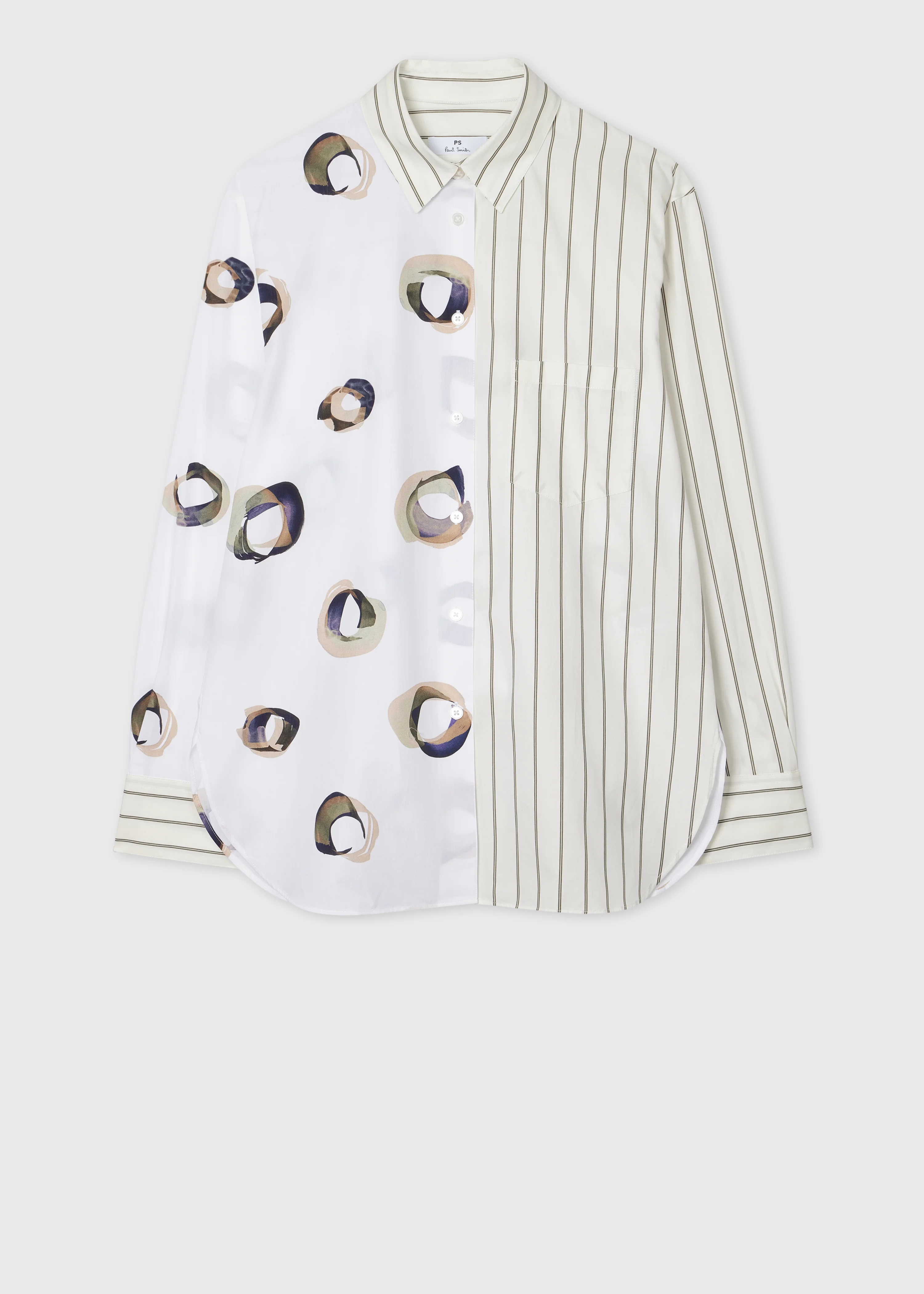 Crafted from crisp cotton, this mixed print shirt features a contrast ecru stripe and seasonal 'Painted Spot' design for a contemporary look. Cut to a relaxed fit, exceptional comfort for everyday wear. This versatile piece pairs perfectly with tailored trousers for a professional appearance or with jeans for a more casual, refined style. The Size Model wears a size 8 Model measures: Height 5’11’’ / 180cm | Chest 30½’’ / 78cm | Waist 24’’ / 61cm The Fit - Relaxed-Fit is loose through the body. Product Code: W2R-331B-T31320-05