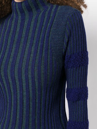 ribbed-knit long-sleeve jumper navy blue lambs wool ribbed knit high neck long sleeves slim cut Imported Composition Lambs Wool 100% SIZE & FIT Model measurements Height 5 ft 10 in(1.78 m) Bust/Chest 33.46 in(85 cm) Hips 35.43 in(90 cm) Waist 24.4 in(62 cm) FittingInformation This piece fits true to size. We recommend you get your regular size Cut for a slim fit Made with a mid-weight fabric