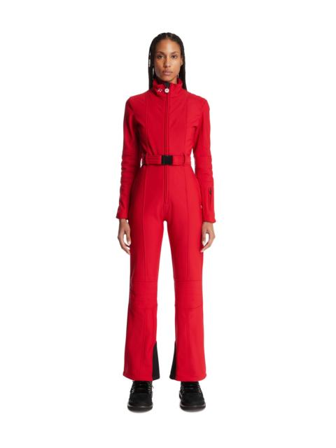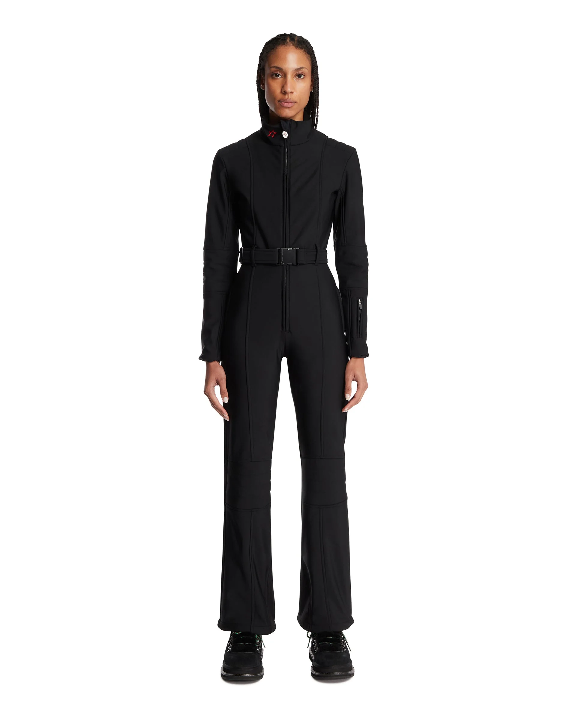 Perfect Moment Black Tignes Ski Suit. Black stretch, waterproof Toray Dermizax fabric, front zip closure with removable belt, two front zip pockets, lined with thermal fleece. External ski pass pocket, adjustable hem zipper for a comfortable fit over boots. Snow gaiters with internal silicone elastic and external snap closures, tear-resistant reinforcements inside the lower leg, helmet-compatible hood with chin guard. Fitted silhouette with flared legs at the hem. Faelly is 178 cm and she is wearing size S. DETAILS Model: W3001300PMB Composition: 80% Nylon, 20% Elastane Made in: ROMANIA Season: FW25-26