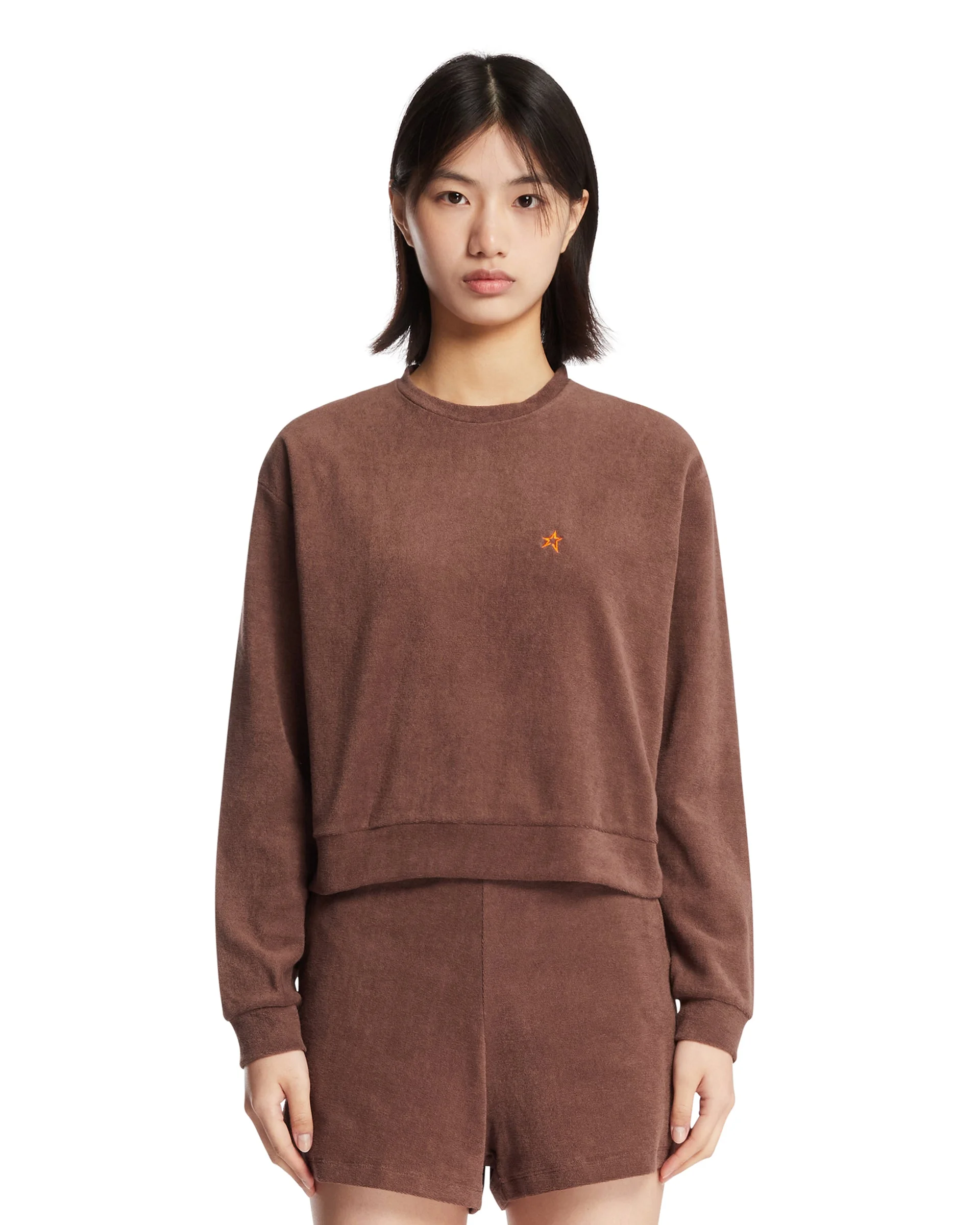 Perfect Moment Brown Terry Sweatshirt. Brown organic cotton with a terry texture, crew neck, long sleeves, contrasting embroidered logo, straight hem. Jenny is 178 cm and she is wearing size S. DETAILS Model: W30013742508MOC Composition: 100% Organic Cotton; Lining: 100% Recycled Polyester Made in: PORTUGAL Season: SS26