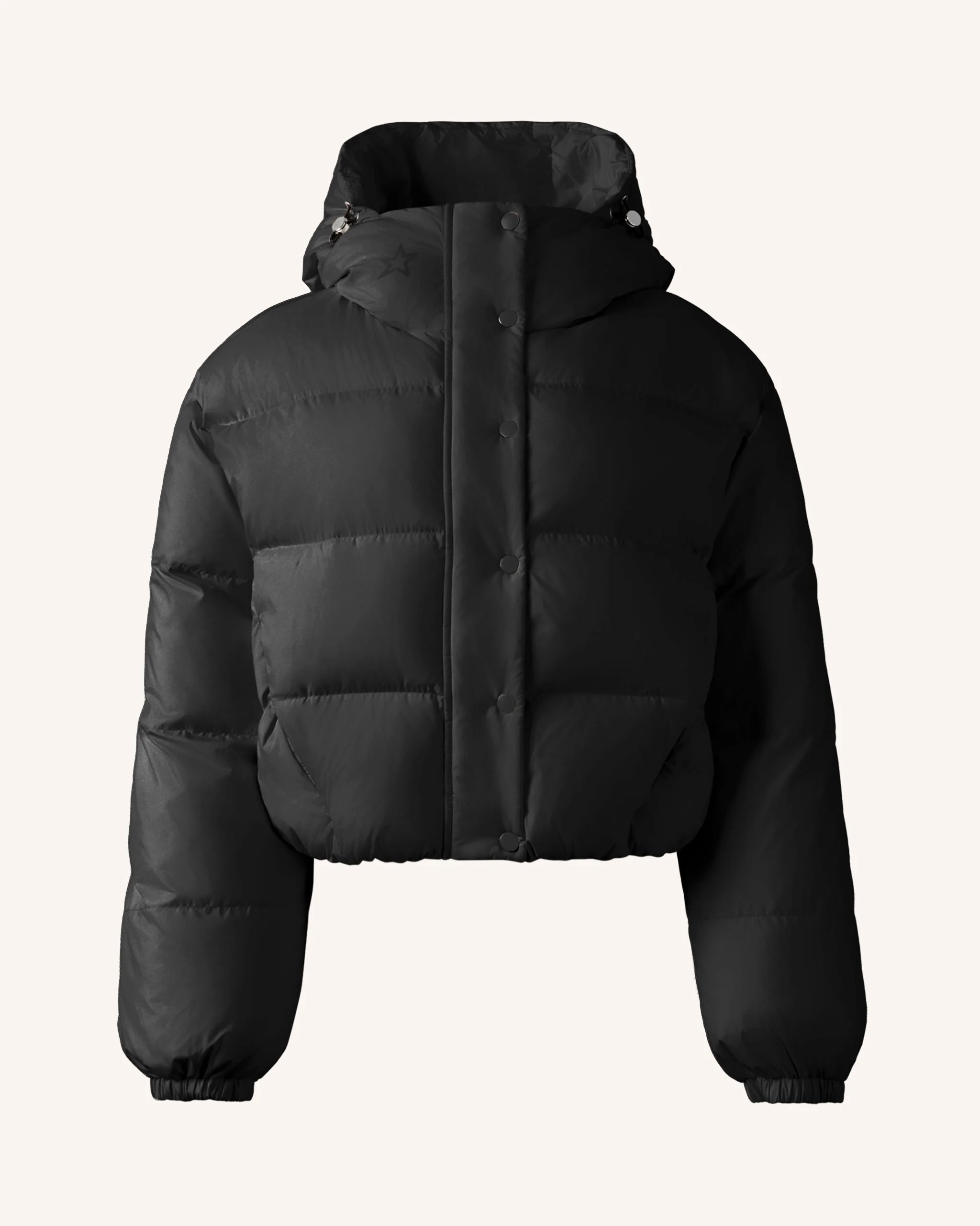 Cropped, cozy, and city-proof. This elevated puffer offers lightweight insulation and a contemporary, slightly oversized shape. Throw it over base layers or a matching knit set. Cropped, slightly oversized fit Lightweight Two front zipped pockets Internal chest zipped pocket Draw-string hem Adjustable draw-string hood Elasticated cuffs Fully water resistant 750-fill-power Allied RDS down Made in Italy Product Code: W30013011703 Materials & Care Materials - Fabric: 100% PL - Lining: 100% PL - Filling: 90% duck down, 10% feathers US Standard Care - Do not wash - Do not bleach - Do not iron - Do not tumble dry - Gentle dry clean only
