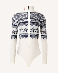 The Intarsia-Knit Merino Wool Bodysuit is a statement-making base layer with a sleek, body-hugging silhouette. Featuring a high mock neck, long sleeves with cut-out shoulders, and a bold snowflake intarsia, it brings graphic impact to performance knitwear. Crafted from soft, breathable Merino wool with a secure snap closure, it’s ideal for layering under ski gear or styling solo for apres. Fitted Snap closure Mockneck Long sleeves This knitwear is delicate. Please treat with caution as abrasion can damage the fabric. May pill slightly, this is natural with fine knit fabric Imported Product Code: W30012502288 Materials & Care Materials - 100% Merino wool Care - Hand wash cold separately - Do not bleach - Lay flat to dry - Cool iron if needed or dry clean