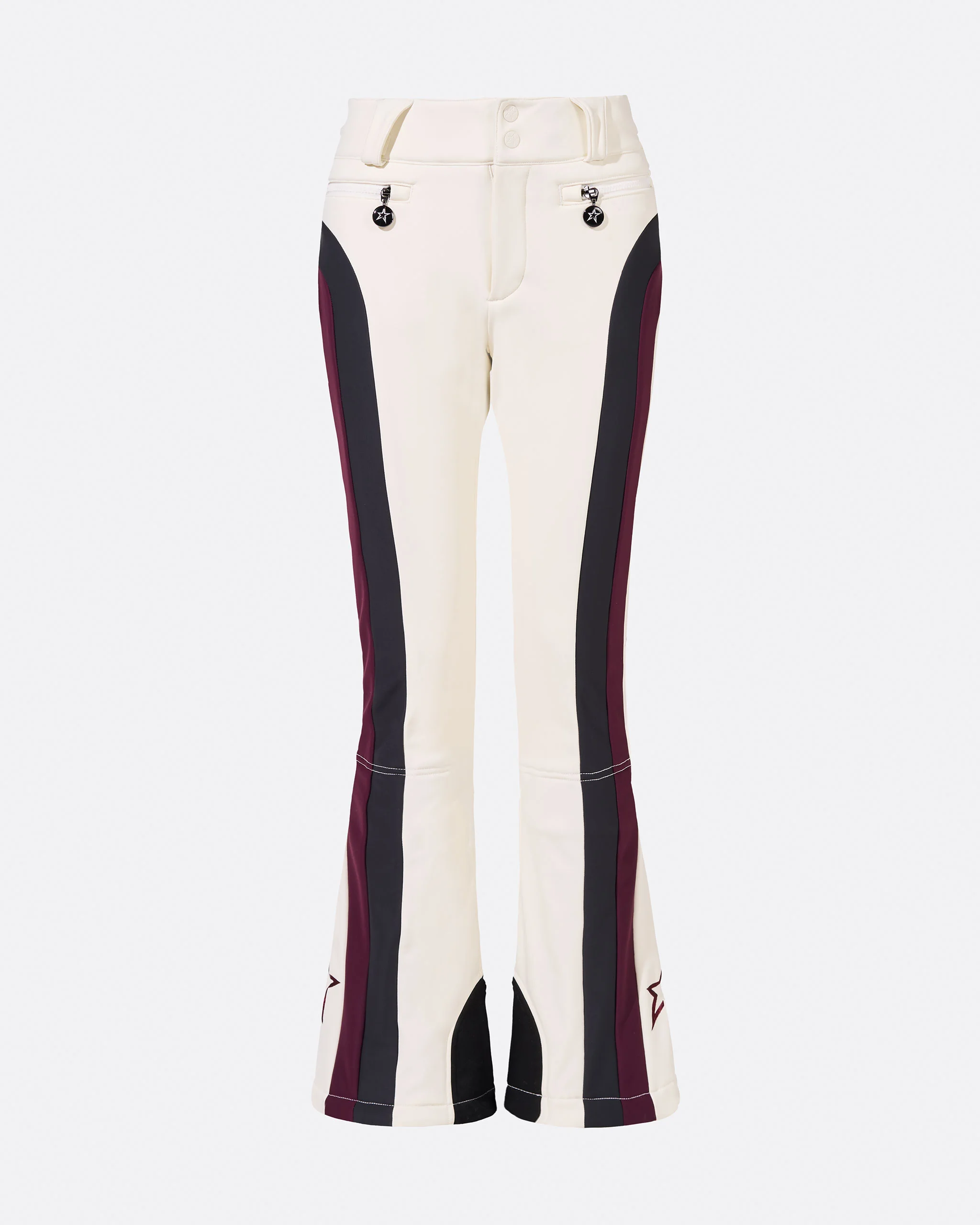 The Queenie Ski Pant has been designed with retro sport-inspired striping detail. Crafted with Toray Dermizax technology, these pants keep you comfortably dry with water-resistant breathability. The 4-way stretch fabric ensures effortless movement. With snow gaiters and an adjustable zipper at the hem to make it easy to adjust your ski boots. Flared silhouette Mid-rise front waist with high-rise back for optimal coverage and unrestricted movement Zip fly with button closure Two front-zip pockets Thermal fleece lining Adjustable zipper at hem to comfortably fit over boots Snow gaiters with interior silicone elastic and exterior snap closures for added protection Anti-tear guards inside lower leg to prevent against damage from sharp skis or boots Unmatched freedom of movement with the 4-way stretch technology Crafted with Toray Dermizax technology, water-resistant and breathable to keep you comfortable and dry Imported Product Code: W30010732187 Materials & Care Materials - Shell: 80% nylon, 20% spandex - Backing: 94% polyester, 6% spandex Care - Machine wash at 40C - Do not bleach - Do not tumble dry - Cool Iron - Dry cleanable