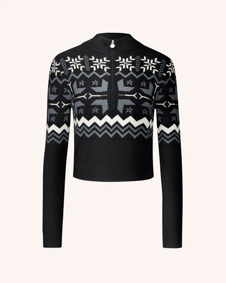 The Nordic Sweater is a winter essential. Crafted from Woolmark-certified Merino wool, it features a slim fit, cropped length, and half-zip neckline—perfect for layering or luxury lounging. Detailed with a snowflake intarsia and finished with rib-knit hems and long sleeves for warmth, it pairs effortlessly with the matching Nordic Wool Legging for a coordinated cold-weather look. Cropped fit Inteded to hit above the hip Half-zip mock neck Long sleeves Rib knit hem and cuffs This knitwear is delicate. Please treat with caution as abrasion can damage the fabric. May pill slightly, this is natural with fine knit fabric Imported Product Code: W30013511703 Materials & Care Materials - 100% Merino wool Care - Hand wash cold separately - Do not bleach - Lay flat to dry - Cool iron if needed or dry clean