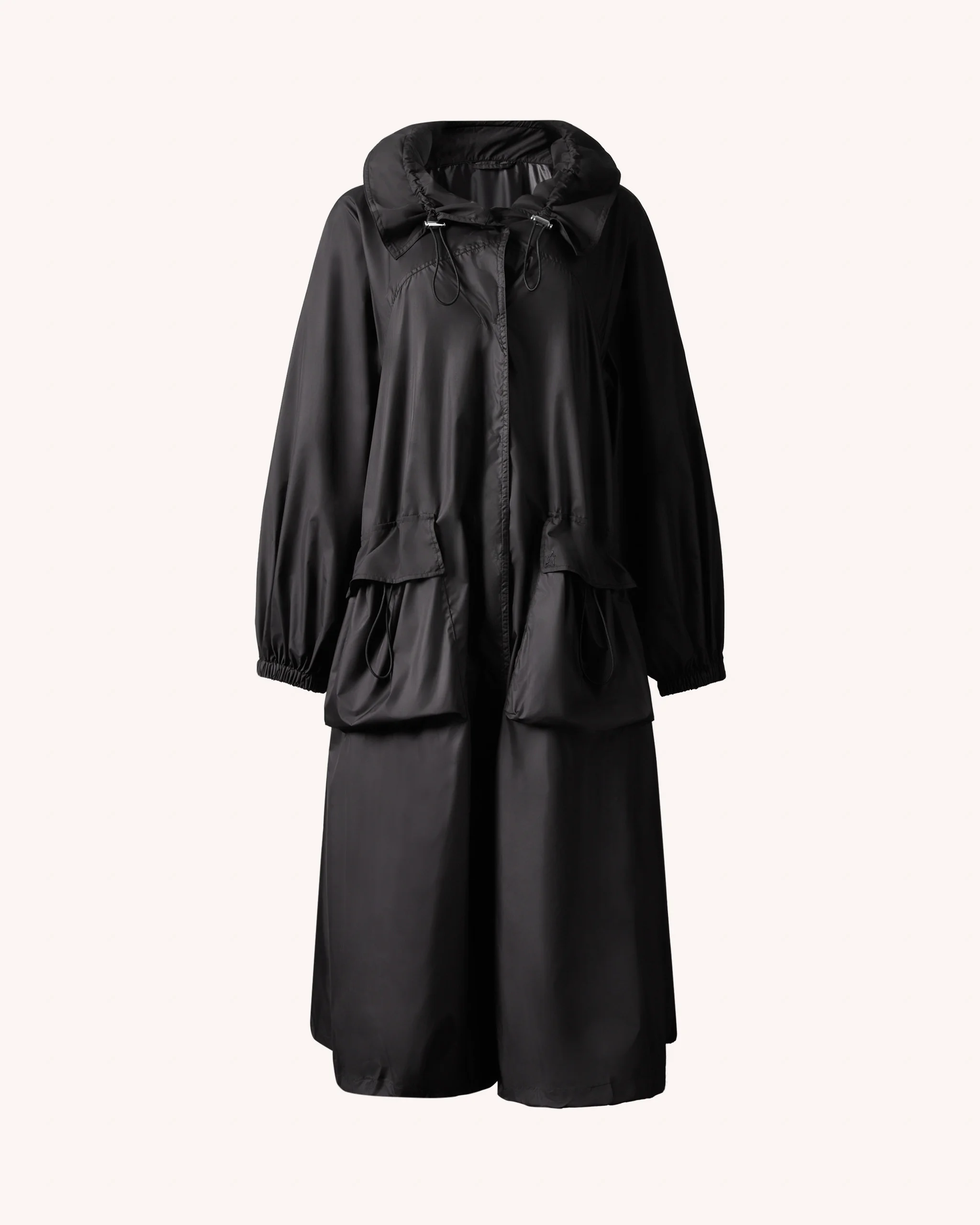Effortless utility styling meets all-weather function. Cut in an oversized fit from GRS‑certified Italian fabric, this lightweight, fully water‑resistant jacket features adjustable draw‑string collar and hem, plus front draw‑string pockets for a custom fit. Finished in sleek black for a versatile, city‑to‑slopes look. Oversized fit Lightweight Two front zipped pockets Internal chest zipped pocket Draw-string waist Adjustable cuffs with poppers Fully water resistant GRS-certified Italian fabric from the Global Recycled Standard Made in Italy Product Code: W30013061703 Materials & Care Materials - Fabric: 100% PL Care - Do not wash - Do not bleach - Do not iron - Do not tumble dry - Gentle dry clean only