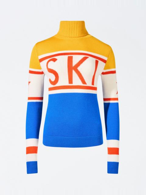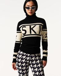 A Perfect Moment icon, the Schild Sweater is our bestselling knit—crafted from soft, temperature-regulating Merino wool for reliable warmth on and off the slopes. With its fitted silhouette and bold “SKI” intarsia across the chest, it delivers signature style in a timeless winter staple. Breathable and versatile, it layers effortlessly under outerwear or stands alone for apres. Pair with any of our Aurora ski pants for a considered, cold-weather look. Fitted Intended to hit at the hip Turtleneck Long sleeves Rib knit hem and cuffs "Ski" intarsia-knit at the center front This knitwear is delicate. Please treat with caution as abrasion can damage the fabric. May pill slightly, this is natural with fine knit fabric Imported Product Code: W30000751703 Materials & Care Materials - 100% Merino wool Care - Hand wash cold separately - Do not bleach - Lay flat to dry - Cool iron if needed or dry clean
