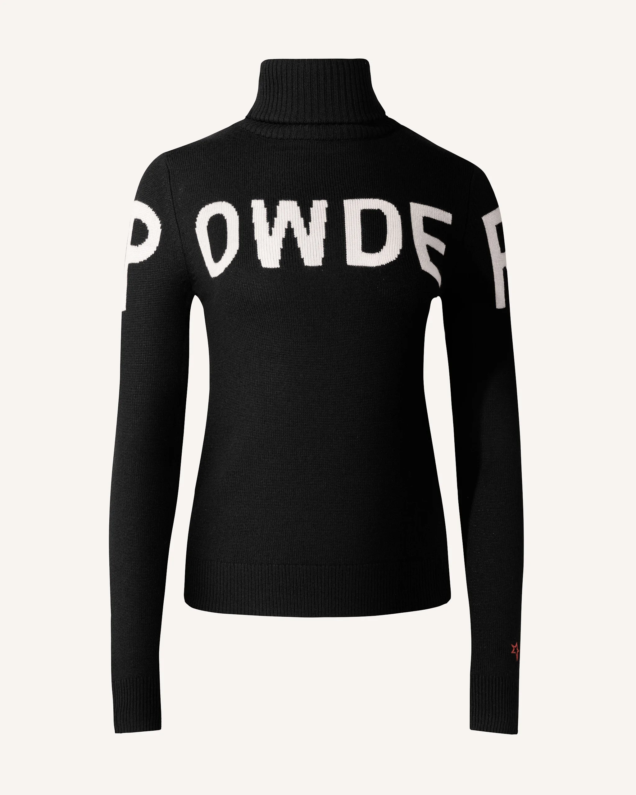 A bold typographic piece, the Powder Sweater features a standout “POWDER” intarsia across the chest—designed to channel the spirit of a perfect ski day. Crafted from Woolmark-certified Merino wool, this slim-fit turtleneck offers breathable warmth with a soft, close-to-body feel. An ideal layering piece for the slopes or apres, finished with ribbed cuffs and hem for a polished silhouette. Fitted Intended to hit at the hip Turtleneck Long sleeves Rib knit hem and cuffs "Powder" intarsia-knit at the center front This knitwear is delicate. Please treat with caution as abrasion can damage the fabric. May pill slightly, this is natural with fine knit fabric Imported Product Code: W30013311703 Materials & Care Materials - 100% Merino wool Care - Hand wash cold separately - Do not bleach - Lay flat to dry - Cool iron if needed or dry clean