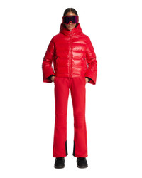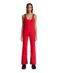 Perfect Moment Red JG Bib Ski Pants. Red stretch Toray Dermizax waterproof technical fabric, lined with thermal fleece. Flared silhouette, front zip closure, additional zips on both sides, adjustable straps, adjustable hem zipper for a comfortable fit over boots. Snow gaiters with internal silicone elastic and external snap closures, tear-resistant reinforcements inside the lower leg. Faelly is 178 cm and she is wearing size S. DETAILS Model: W3001298RED Composition: 80% Nylon, 20% Elastane Made in: ROMANIA Season: FW25-26