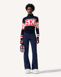 A Perfect Moment icon, the Schild Sweater is our bestselling knit—crafted from soft, temperature-regulating Merino wool for reliable warmth on and off the slopes. With its fitted silhouette and bold “SKI” intarsia across the chest, it delivers signature style in a timeless winter staple. Breathable and versatile, it layers effortlessly under outerwear or stands alone for apres. Pair with any of our Aurora ski pants for a considered, cold-weather look. Fitted Intended to hit at the hip Turtleneck Long sleeves Rib knit hem and cuffs "Ski" intarsia-knit at the center front This knitwear is delicate. Please treat with caution as abrasion can damage the fabric. May pill slightly, this is natural with fine knit fabric Imported Product Code: W30013271701 Materials & Care Materials - 100% Merino Wool Care - Hand wash cold separately - Do not bleach - Lay flat to dry - Cool iron if needed or dry clean