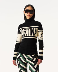 Inspired by the legendary Italian ski resort, the Cortina Merino Wool Sweater brings alpine heritage to the forefront. With a fitted silhouette, hip-grazing hem, and bold “CORTINA” intarsia, it delivers timeless slope-to-apres appeal. Crafted from soft, breathable Merino wool, it features a cosy turtleneck, ribbed cuffs, and hem for warmth and structure. Style with high-waisted ski pants or layer under outerwear for a graphic, winter-ready look steeped in alpine attitude. Fitted Intended to hit at the hip Turtleneck Long sleeves Rib knit hem and cuffs "Cortina" intarsia-knit at the centre front This knitwear is delicate. Please treat with caution as abrasion can damage the fabric. May pill slightly, this is natural with fine knit fabric Imported Product Code: W30013281703 Materials & Care Materials - 100% Merino wool Care - Hand wash cold separately - Do not bleach - Lay flat to dry - Cool iron if needed or dry clean