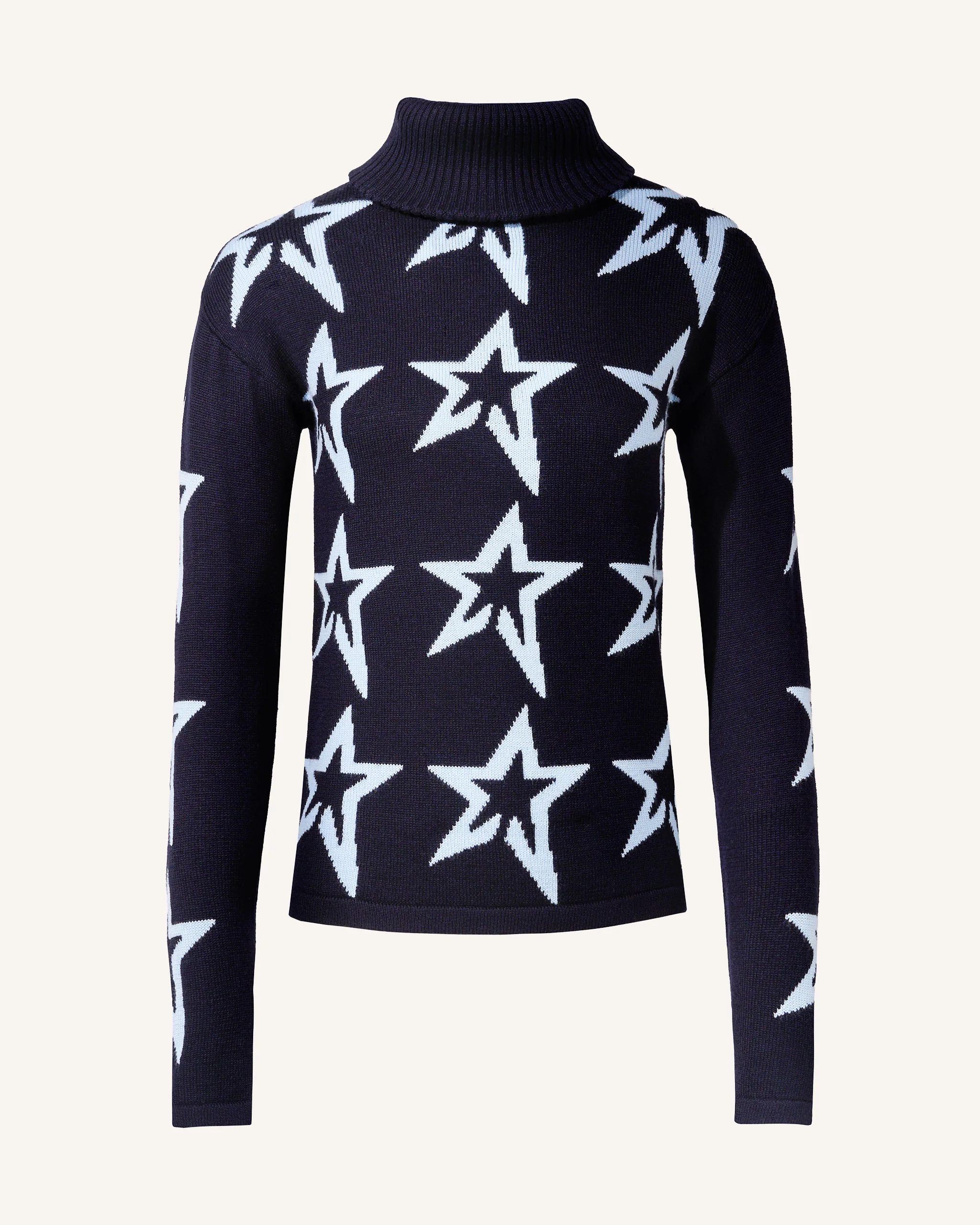 A standout piece on and off the slopes, the Star Dust Sweater features our signature star intarsia across a sleek, fitted silhouette. Crafted from Woolmark-certified Merino wool, it’s naturally breathable and temperature-regulating—keeping you warm when it’s cold, and cool when it counts. With a snug turtleneck and streamlined fit, it layers perfectly under salopettes or makes a graphic statement apres. Fitted Intended to hit at the hip Turtleneck Long sleeves Rib knit hem and cuffs All-over signature star print This knitwear is delicate. Please treat with caution as abrasion can damage the fabric. May pill slightly, this is natural with fine knit fabric Imported Product Code: W30000902238 Materials & Care Materials - 100% Merino wool Care - Hand wash cold separately - Do not bleach - Lay flat to dry - Cool iron if needed or dry clean