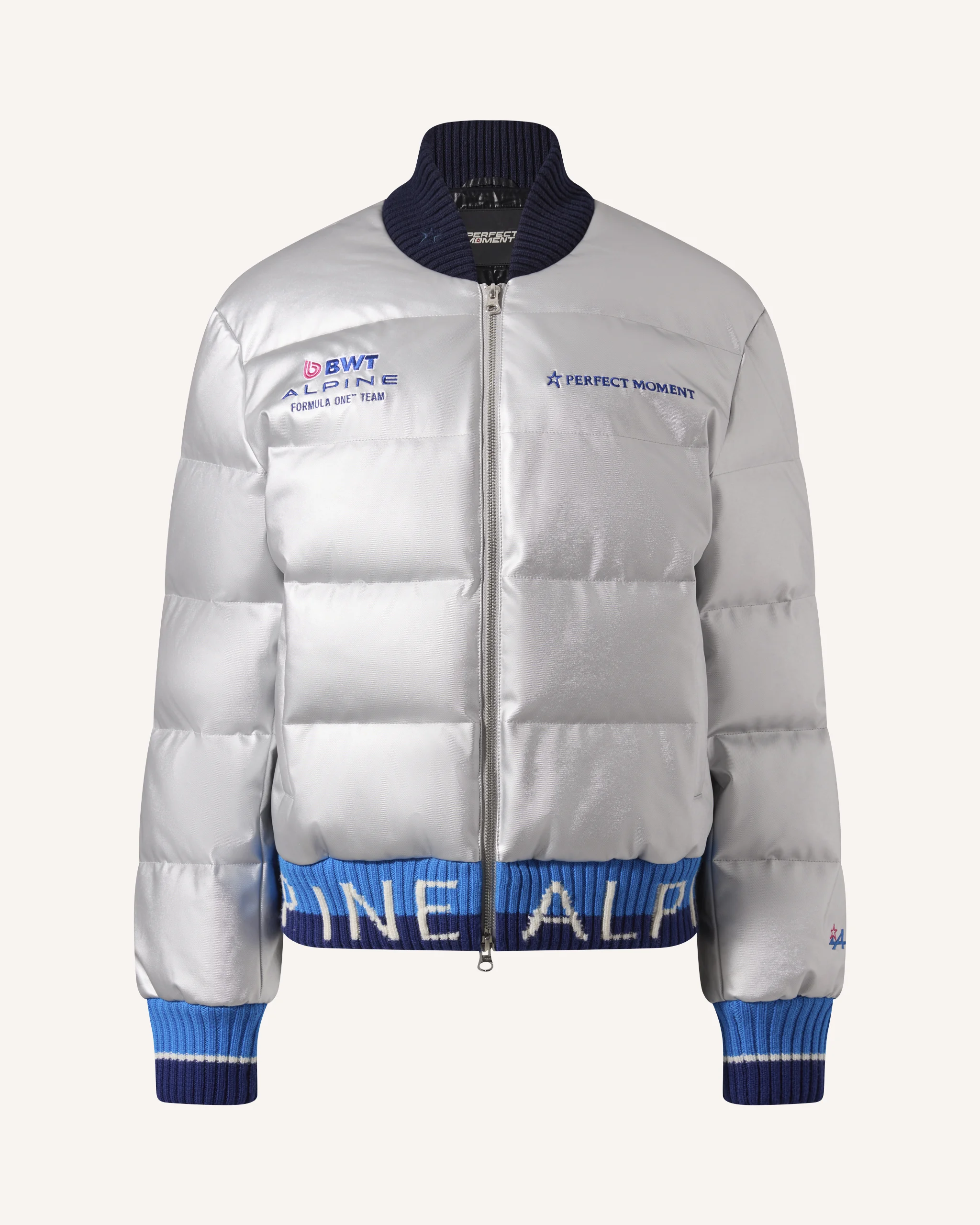 A standout layer engineered for both altitude and attitude, the Unisex Silverstone Bomber in Silver Twill Merino Wool blends alpine warmth with motorsport precision. Designed with bold rib-knit trims in Alpine blue, it features dual branding across the chest and a statement Perfect Moment star embroidered across the back for a dynamic, race-ready finish. Structured yet easy to wear, it delivers everyday comfort with a polished, modern silhouette—perfect from the slopes to the paddock. Imported Product Code: U80002292370 Materials & Care Materials - Shell: 57% nylon, 29% Polyurathene, 14% spandex - Knit Trim: 100% Merino wool - Lining: 100% recycled polyester - Insulation: 80% duck down, 20% feather Care - Machine wash at 30'C - Do not bleach - Do not Iron - Do not Tumble - Do not wring - Do not use fabric softener - Wash with fasteners closed - Dry clean