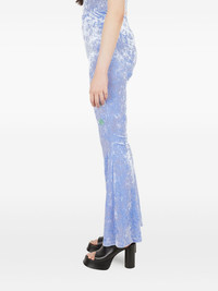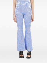 crushed-velvet flared trousers Highlights - Lilac purple - Crushed velvet texture - High rise - Elasticated waistband - Graphic embroidery - Flared leg Imported Composition Polyester 95%, Spandex/Elastane 5% Washing instructions Read Manufacturer Guidelines
