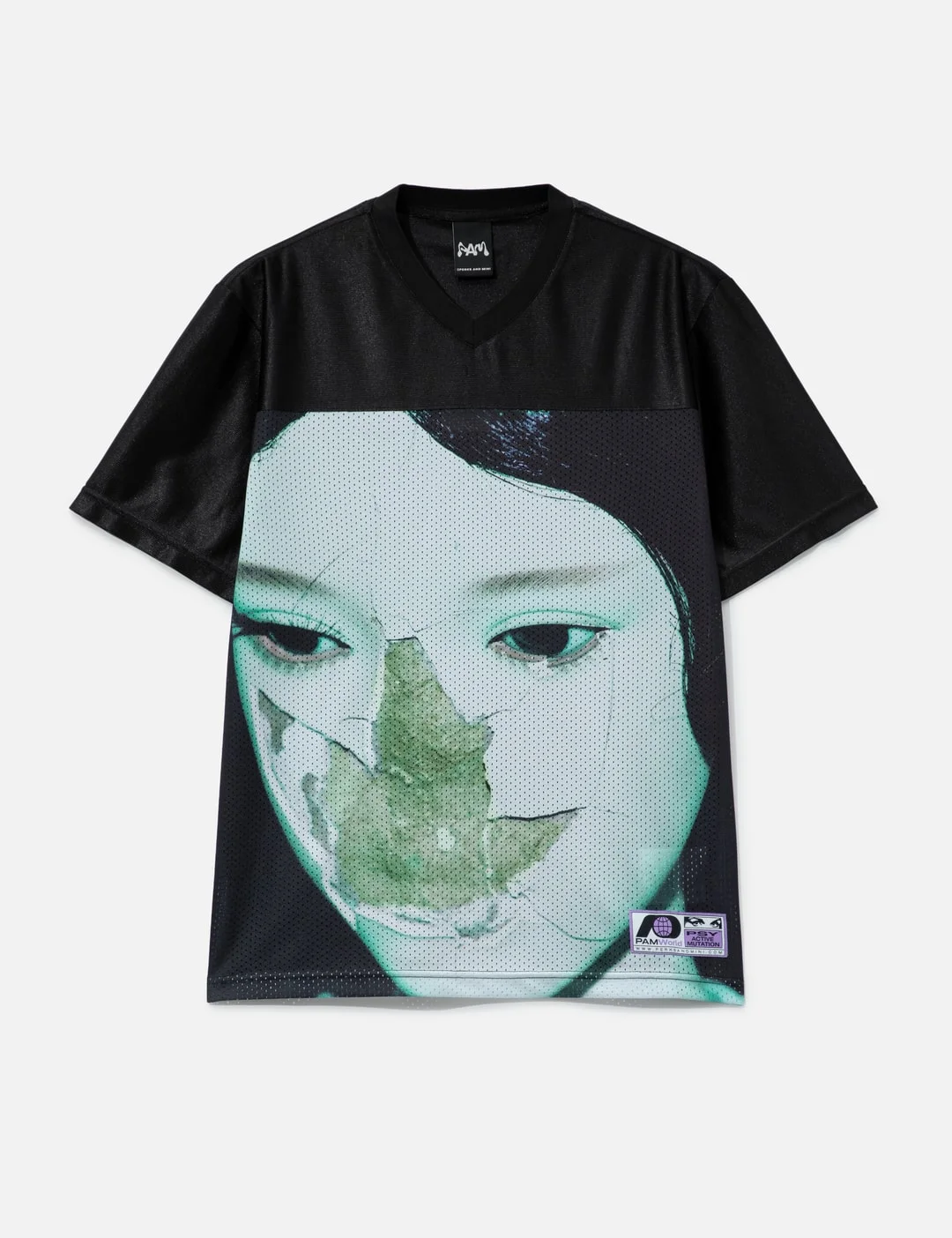 - Perks and Mini - Football Jersey - Joshua Gordon - Ribbed v-neck - Short sleeve - Glossy sports fabric with mesh body - Digital print of artwork by Joshua Gordon on front panel - “P.A.M.” label at front hem - Color: Black - Material: 100% Polyester; Rib: 95% Polyester, 5% Spandex - See more SS T-Shirts, T-Shirts and Clothing - Model wears size M - Model measures: Height 187cm, Chest 35.4”/90cm, Waist 27”/69cm, Hip 36”/91cm - Model wears size S - Model measures: Height 179cm, Chest 31’’/79cm, Waist 24’’/61cm, Hip 36.4’’/92.5cm - Vendor Code: 3862