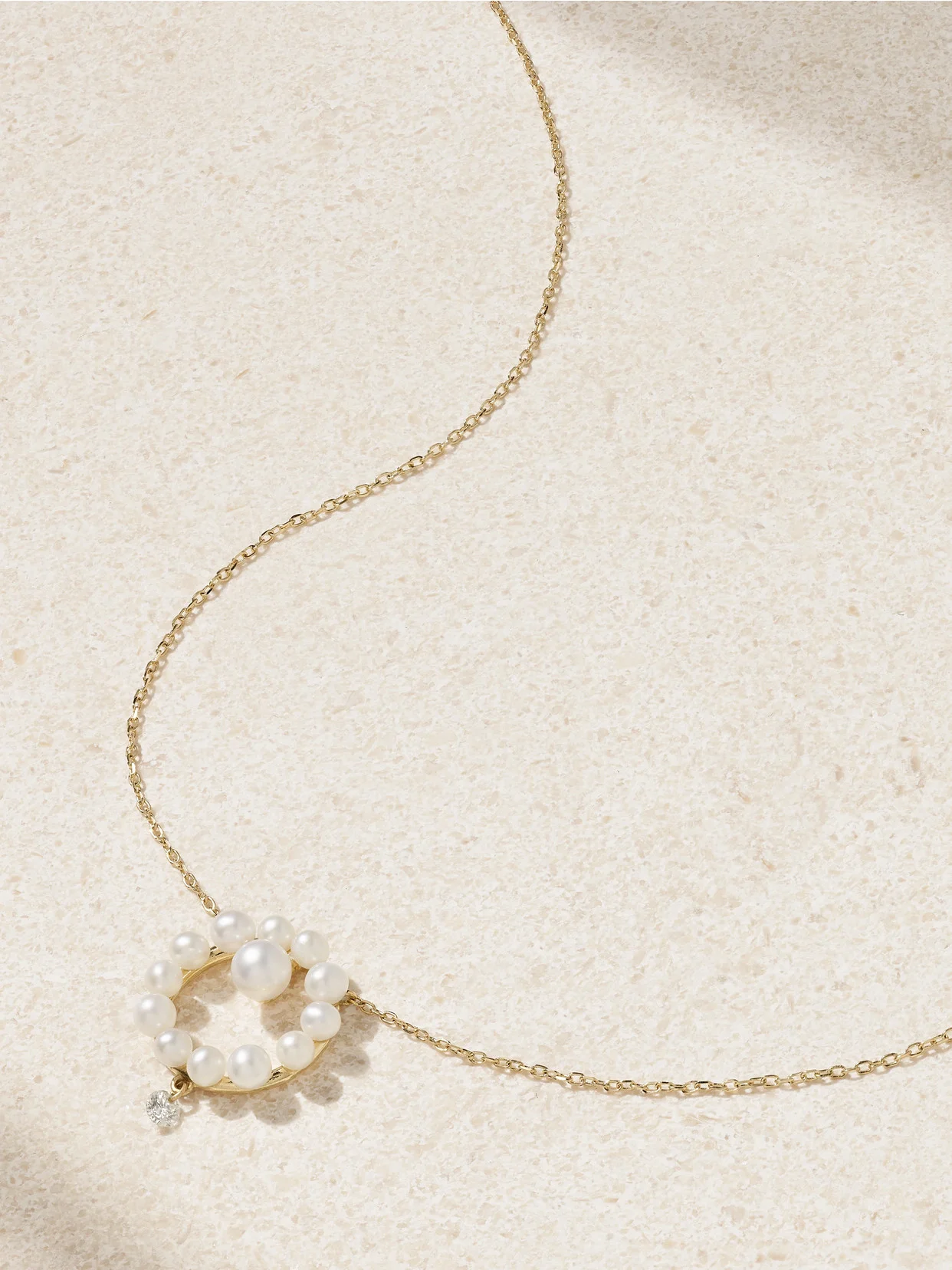 Designed with such beautiful shapes, Persee's contemporary jewelry is meant to be worn often and loved forever. This necklace is cast from 18-karat gold and strung with a circular pearl-embellished pendant featuring a single 'pierced' diamond - the technique highlights the brilliance of the stone without the need for a setting.