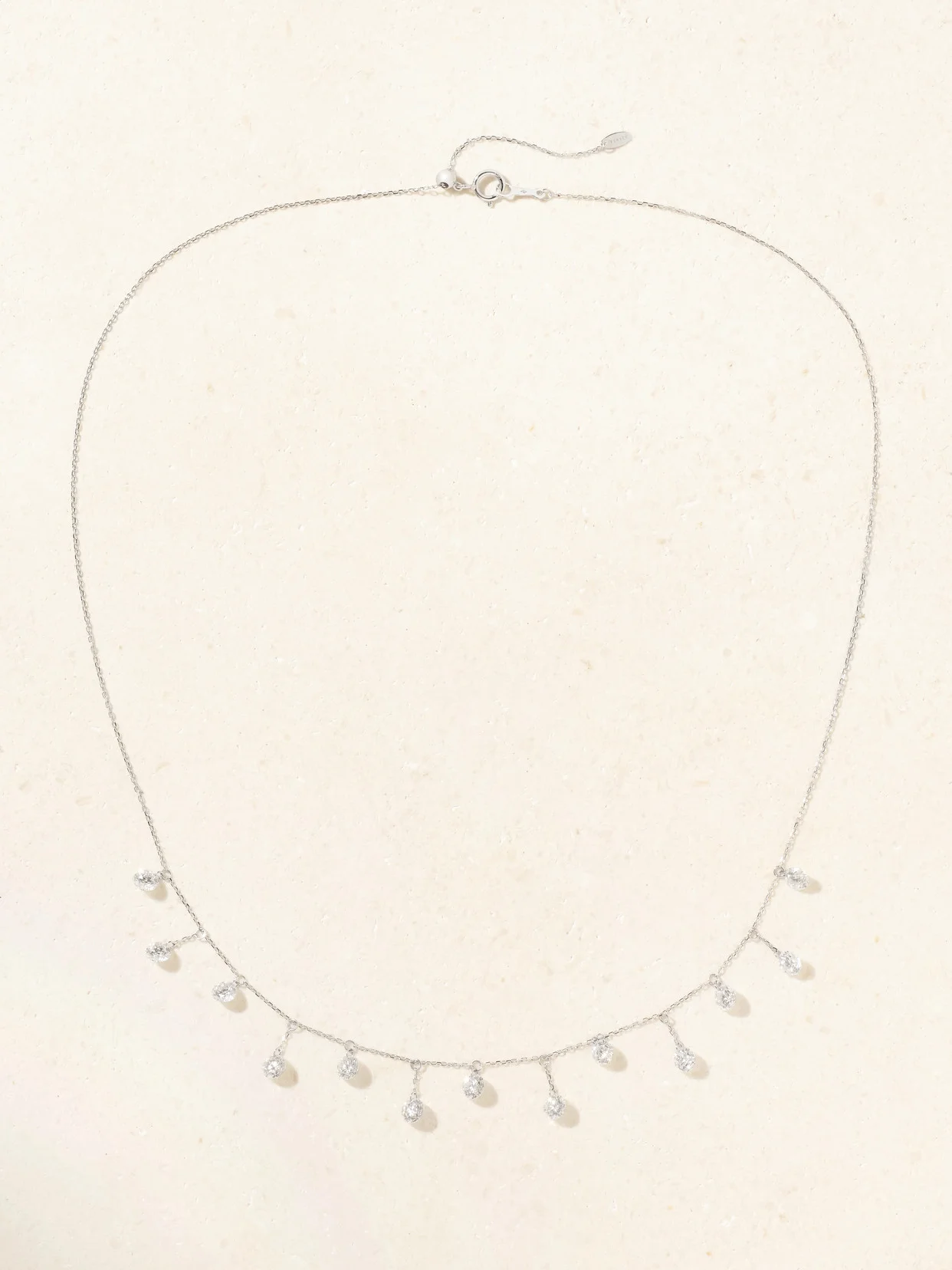 Simple and elegant, Persee's fine jewelry celebrates the natural beauty of precious gemstones. This necklace is crafted from 18-karat white gold and strung with 13 shimmering diamonds that appear as if they're floating on the skin. Wear it to complement scooped or sweetheart necklines.