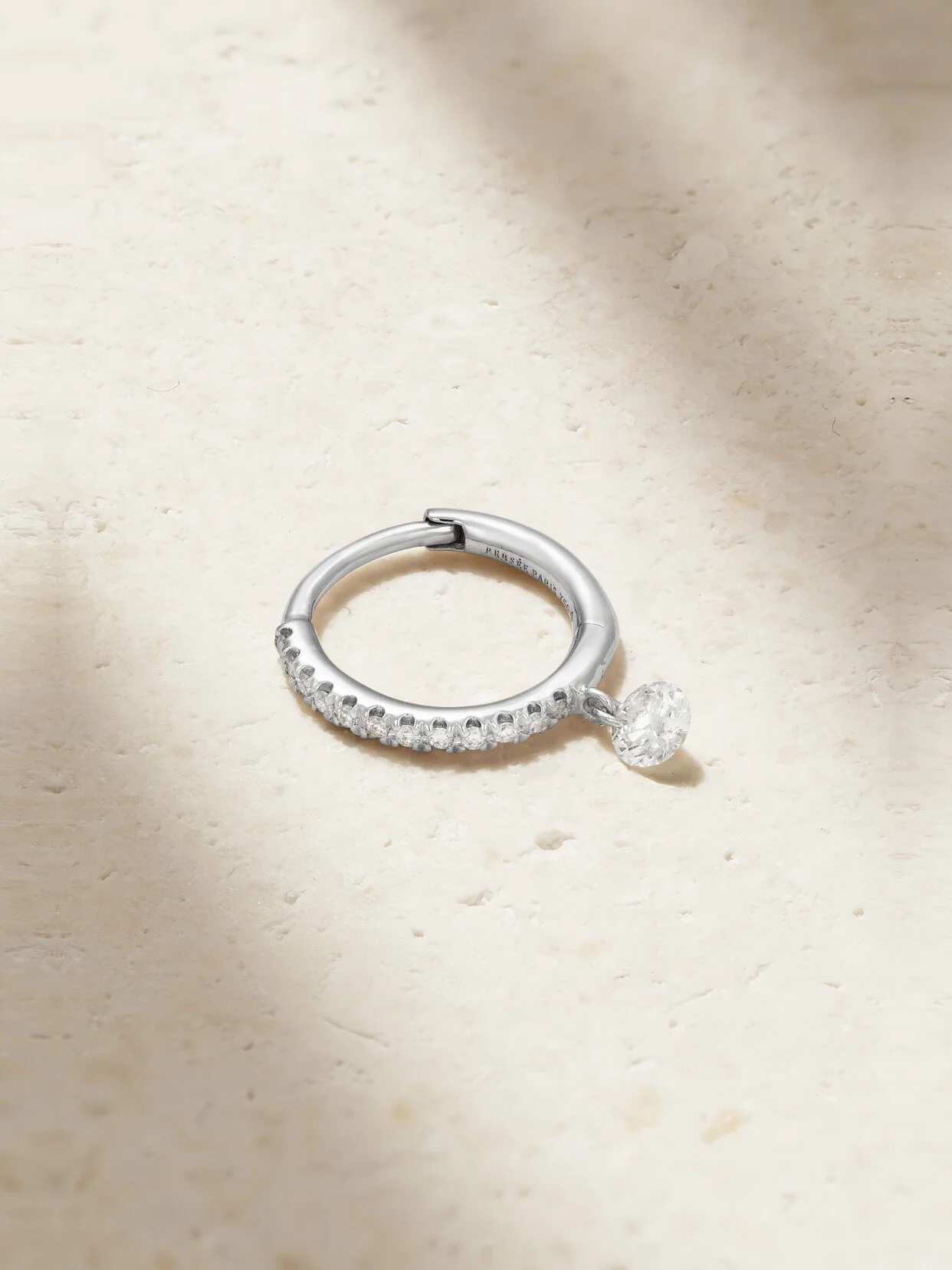 Persee's simple designs celebrate the natural beauty of precious gemstones. This earring is cast from 18-karat white gold and studded with sparkling diamonds - the floating charm was created using the brand's signature 'pierced' technique.