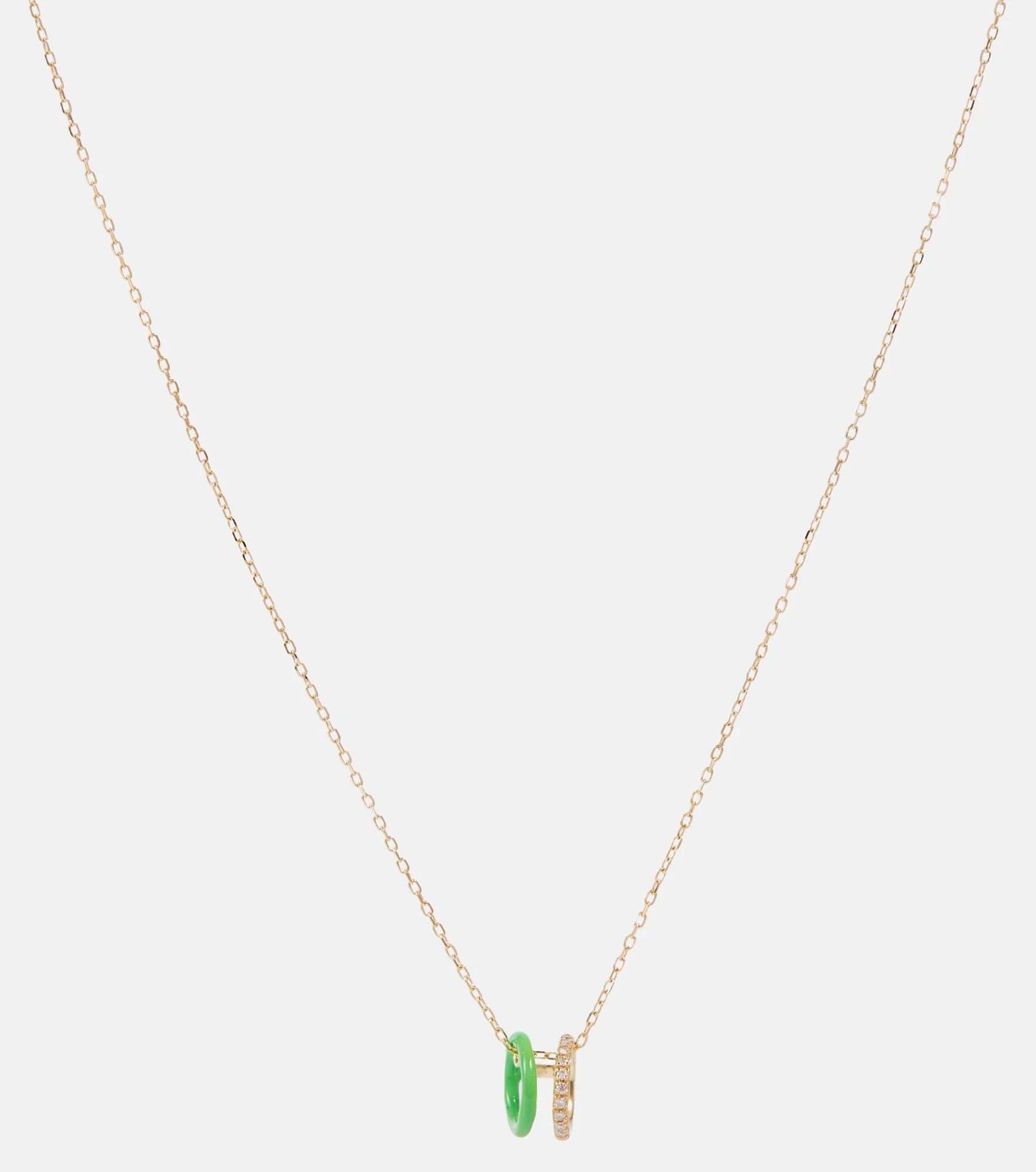 This necklace is one of Persée's more playful fine jewelry designs. The neon-colored enamel hoop makes the dainty 18kt yellow gold chain really pop, while the second pendant has pavé-set diamonds for a sparkling finish. Plus, the chain can be adjusted so it can be worn at any length. Product Details - Material: 18kt yellow gold, enamel - Made in Italy - Stone I: diamond, pavé setting - Closure: lobster-clasp fastening - Item number: P00633625 Size & Fit - Adjustable length - Length when open 41cm-16" - Pendant length 7mm-0.3" - Pendant width 5mm-0.2"