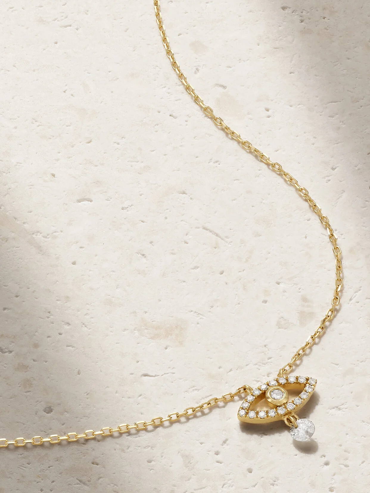 Persee's diamonds are designed to look like they're floating - the illusion is created using the brand's signature 'pierced' technique, which its founder learned from jewelry artisans in Japan. This necklace is cast from 18-karat gold and strung with a dainty pave-frosted 'Evil Eye' pendant.