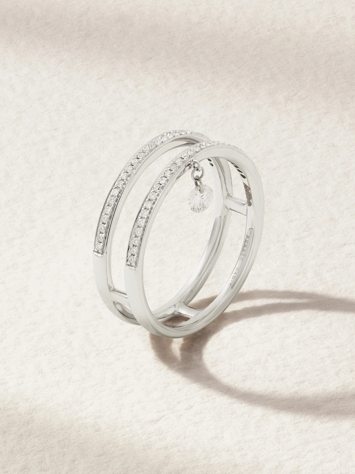 Persee's 'Zeus' ring is crafted from 18-karat white gold and has two connected bands, each traced with sparkling pave diamonds. An additional "pierced" diamond drop swishes freely, so it can be admired from all angles.