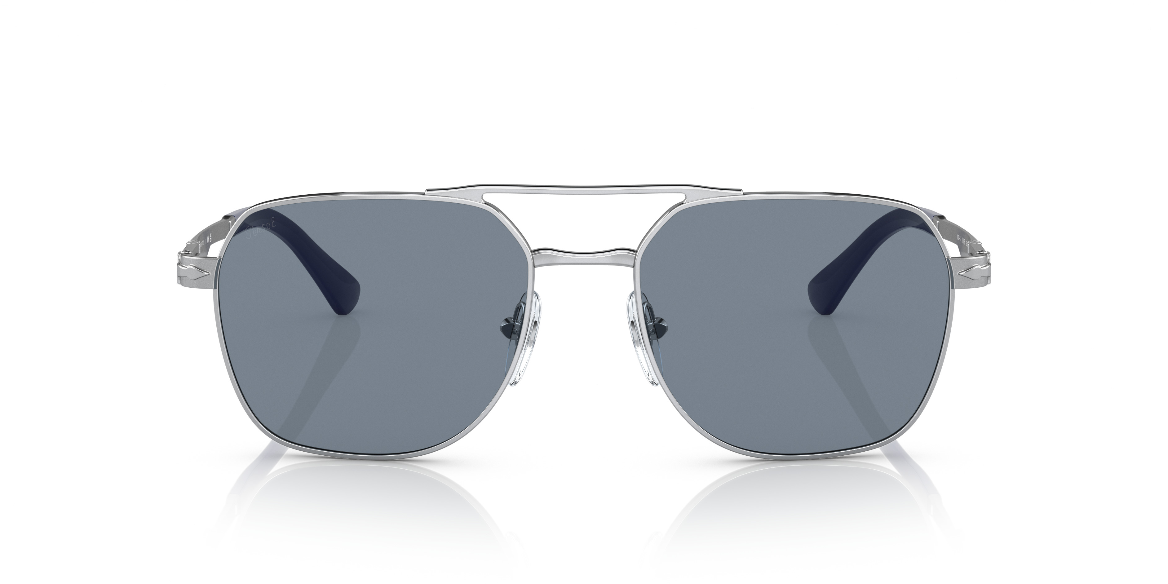 New Persol pilot shape characterised by metal temples with flex hinges and differently colored temple tips for a unique design twist. MODEL CODE: PO1004S 518/56 55-18 FRONT COLOR: Silver LENS COLOR: Light Blue LENS MATERIAL: Crystal FRAME MATERIAL: Steel FIT: Regular Fitting BRIDGE CHOICE & NOSEPAD: Adjustable Nosepads MADE IN: Italy