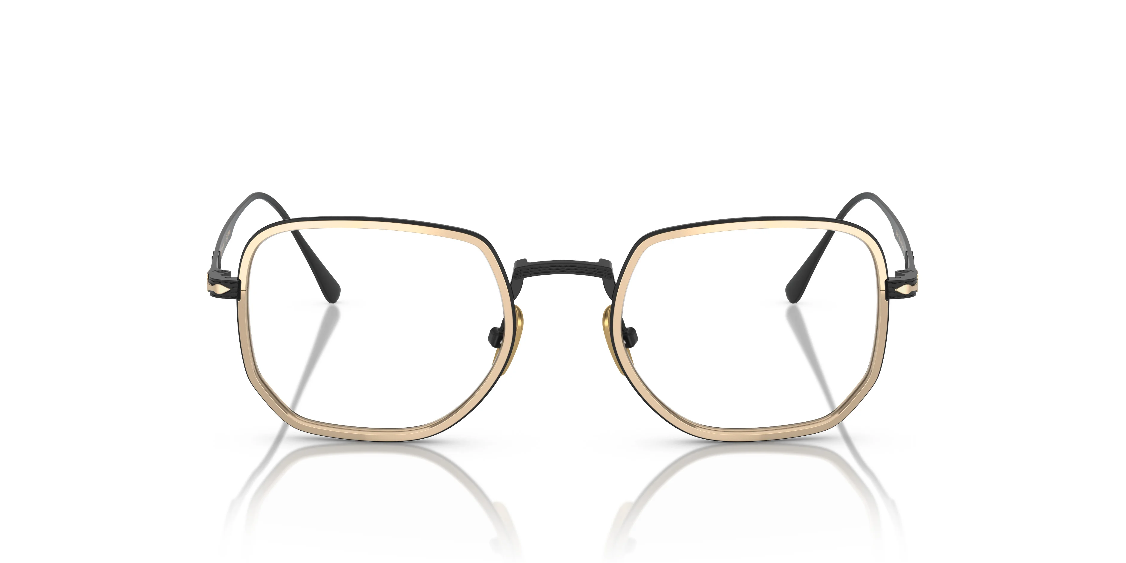 The Titanium collection, where Italian artisans and Japanese masters unite to create this rectangular shape with branded titanium nosepads that redefine Persol's legendary craftsmanship. MODEL CODE: PO5006VT 8008 47-20 FRONT COLOR: Black/Gold LENS COLOR: Clear LENS MATERIAL: Plastic FRAME MATERIAL: Titanium FIT: Narrow Fitting BRIDGE CHOICE & NOSEPAD: Adjustable Nosepads MADE IN: Japan